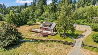 rare opportunity for that unique individual who says I want home by a babbling creek with fish and wildlife to enjoy. A bridge to a barn and gardening space. Lots of space to run and play with peace and quiet surrounding me. This well-cared for 2 story home with the primary on the main floor awaits your personal touches to make yours. Real cedar siding wraps this home and separate oversized 2 car garage. You must see this picturesque setting to believe it exists in University Place. Driving in you pass the orchard that is abundant with all kinds of fruit varieties, there are several separate designated garden areas, trees and plenty of parking.