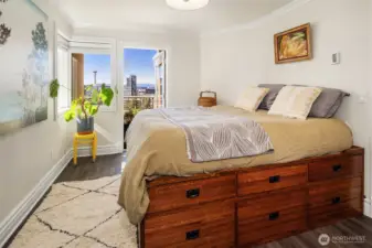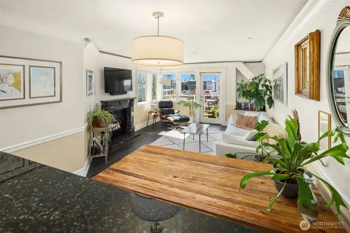 A rare opportunity to own a truly special artist’s retreat perched on Capitol Hill in the boutique Highmark. Lovingly owner-occupied and thoughtfully curated, this corner 2-bedroom residence lives like a downtown penthouse, wrapped in cinematic west-facing views of the Space Needle, Seattle skyline, Lake Union, the Olympic Mountains, and unforgettable sunsets. From the moment you arrive at the semi-private entry shared with just one neighboring home, the space feels intimate and distinctly personal. Two private view balconies invite morning coffee and evenings spent entertaining above the city lights. Inside, beautifully upgraded finishes include hard-surface flooring throughout, air conditioning, a gas fireplace, and a chef’s kitchen with granite counters, stainless steel appliances, and gas cooking. The primary suite is a sanctuary unto itself, complete with its own view balcony, walk-in closet, and a spa-inspired bath featuring a clawfoot soaking tub and walk-in shower. A second bedroom and full bath, secure garage parking ideally located next to the elevator, and dedicated storage directly across the hall add everyday ease. Pet-friendly, no rental cap, and impeccably positioned in one of Capitol Hill’s most vibrant pockets. Just moments to light rail, Broadway, Downtown, parks, and some of Seattle’s best dining. This is more than a condo; it’s a home that has been deeply enjoyed, beautifully cared for, and now offers a rare chance for its next owner to make it their own.