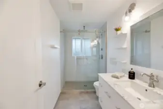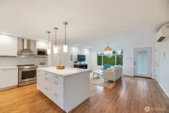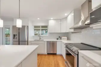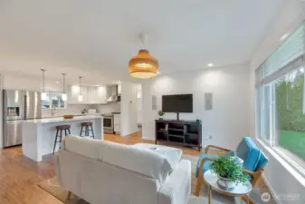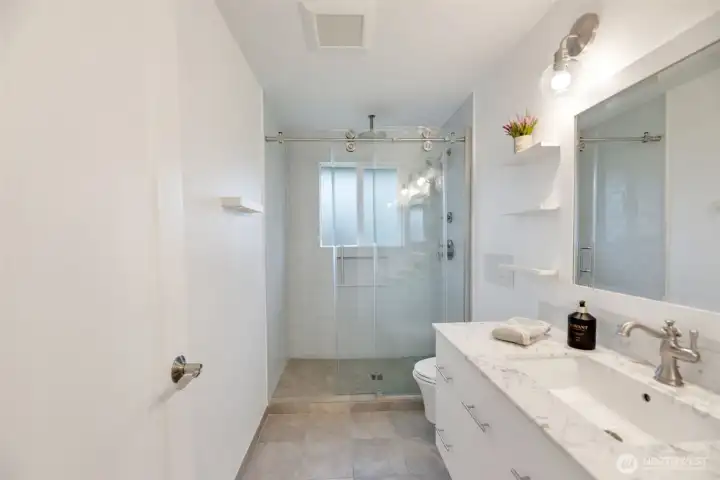 Beautifully remodeled and truly move-in ready light-filled 3-bedroom classic rambler on a quiet cul-de-sac in the Renton Highlands—offering the perfect balance of privacy, convenience, and modern comfort. Thoughtfully updated w/ a clean, contemporary design. The stunning kitchen features quartz countertops, high-quality cabinetry, premium appliances & a powerful vent hood. The bathroom delivers a tranquil experience with a glass tile shower, multi-rain heads, heated tile, granite countertop & wall-mounted vanity and toilet. Rich bamboo flooring throughout, complemented by radiant underfloor heating for cozy comfort year-round. Enjoy efficient heating and cooling with a ductless mini-split system w/ zoned controls. Smart features like hardwired ethernet & built-in sound systems. Oversized flat yard—fully fenced, landscaped & bordered by mature hedges in front for exceptional privacy. The expansive covered deck creates a seamless indoor-outdoor living experience. Large bright custom outbuilding offers flexible space w/ potential to create a home office, studio, gym, garden shed or additional storage. A flat driveway provides ample parking —ideal for multiple vehicles or recreational needs. Extensive system upgrades including a newer roof, updated electrical & plumbing, double-pane windows, fresh interior & exterior paint—nearly every major component has been thoughtfully modernized. Conveniently located near shopping, dining, parks & major commuting routes. A rare find!