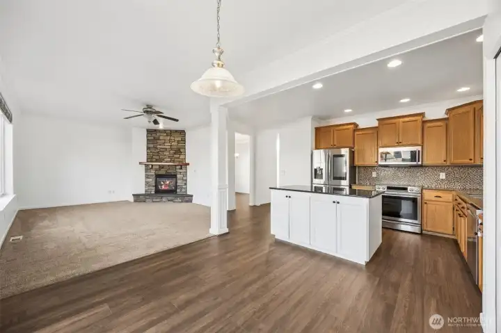 Tastefully updated home in the desirable Lipoma Firs North community featuring a grand entry with soaring vaulted ceilings! Elegant formal dining room with new LVP floors and crown molding. Main floor office/den with glass door. Inviting living room showcases a stunning floor-to-ceiling stacked stone gas fireplace with custom mantle and ceiling fan. Convenient nook with built-in desk/tech space. The kitchen is a standout with granite countertops, full-height glass tile backsplash, pantry, newer stainless-steel appliances, and crown molding on cabinetry. Upstairs offers three spacious guest bedrooms, plus full guest bath ft. quartz counters and painted cabinetry plus laundry room with washer and dryer included. The luxurious primary suite features French doors, vaulted ceilings, ceiling fan, and a walk-in closet with custom built-ins- plus a Spa-like 5-piece primary bath with ceramic tile floors and a relaxing jetted soaking tub. Enjoy the fully fenced backyard with patio space and a low-maintenance yard—perfect for relaxing or entertaining. Additional highlights include fresh interior and exterior paint, carpet and A/C for year-round comfort all installed in 2020. Pre-wired for Generator. Centrally located near community parks, shopping, schools, and entertainment!