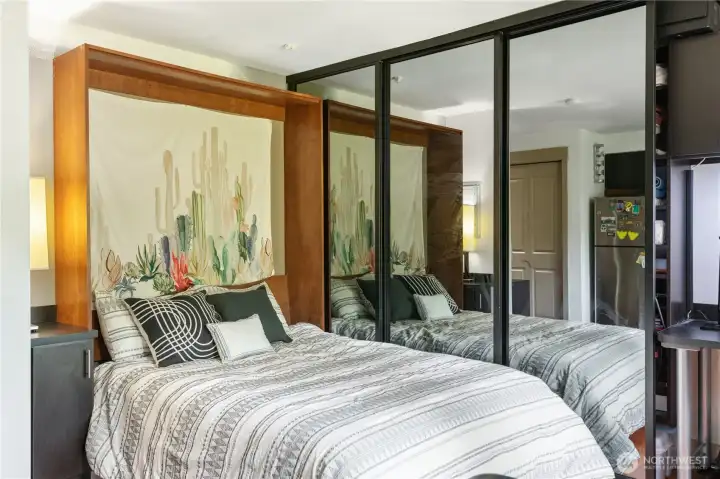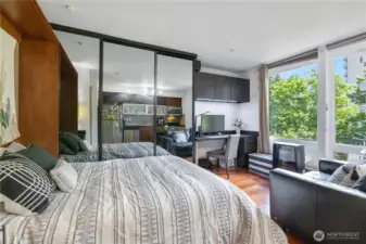 BEST value dorm alternative, Fully Furnished Studio unit in a modern building in the heart of U-District, 1/2 mile from UW. Customized furniture including: queen-sized Murphy Bed w/mattress/nightstand, built in desk, California Closet, foldable dinning table, leather sofa chair, a lot of storage and in unit W/D! Air conditioner included. The kitchen is updated and with SS appliances. Spacious full bath. Unit also come with 1 secured parking space and a secured storage unit. Building features a rooftop deck w/views of Seattle skyline, plenty of room for BBQ and a community room for hosting gatherings. Excellent Walk Score of 94, close to bus, light rail, and UW campus. NO RENTAL CAP.
