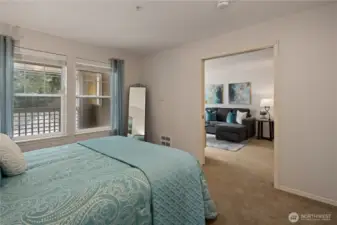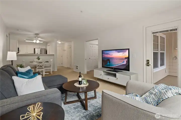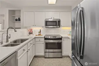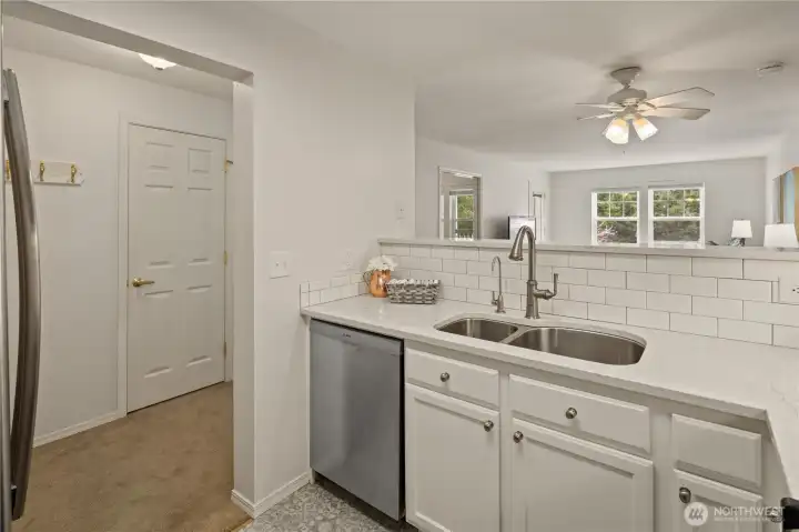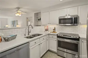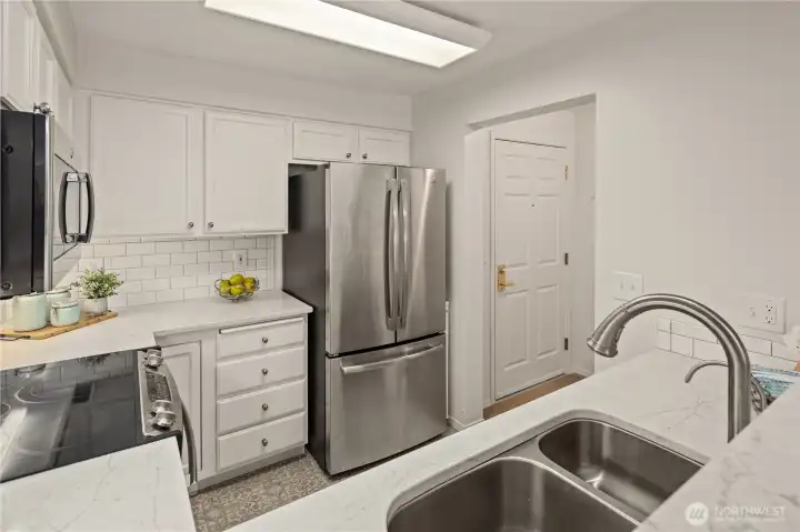 Care-free living awaits in this beautifully remodeled top-floor condo featuring 2 bedrooms, 2 baths, and two private covered balconies in the premier 55+ Providence Point community in Issaquah. The dreamy kitchen shines with stainless steel appliances, quartz countertops, RO system, under-cabinet lighting, and classic shaker cabinetry. Enjoy an open-concept living and dining area with access to an east-facing balcony—perfect for morning coffee and cool afternoon shade. The spacious primary suite offers a second covered balcony, a generous walk-in closet, and an updated bath with a step-in shower. A thoughtful split-bedroom layout places the second bedroom and bath on the opposite side of the home for added privacy. Smart storage solutions include custom pull-out shelves in the hall closet, a space-saving spice rack, and an additional storage room just down the hall. A convenient 1-car garage adds ease to daily living. The Pacific Building—Washington Village’s newest—offers guest parking, inviting gathering spaces on every floor, and a west-facing patio ideal for enjoying afternoon sun and friendly conversation. Experience independent living surrounded by vibrant amenities: indoor pool, clubhouse, fitness classes, tennis, pickleball, putting green, pea-patch gardens, scenic walking trails, and a full calendar of social, cultural, and recreational events.