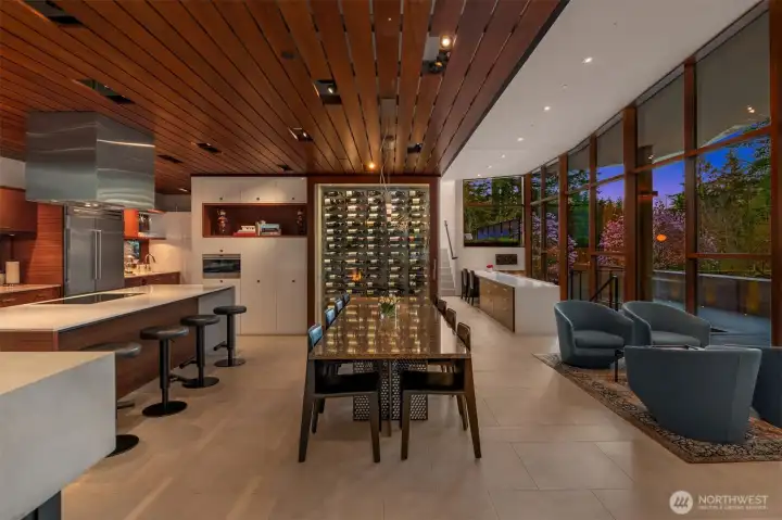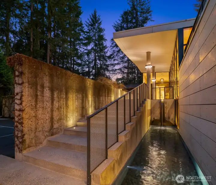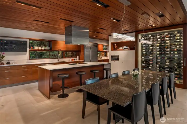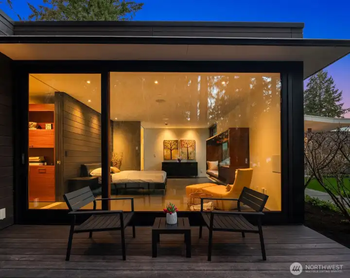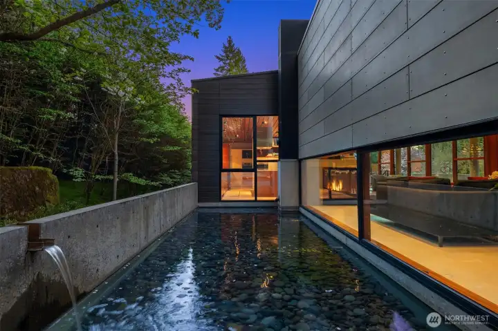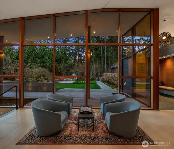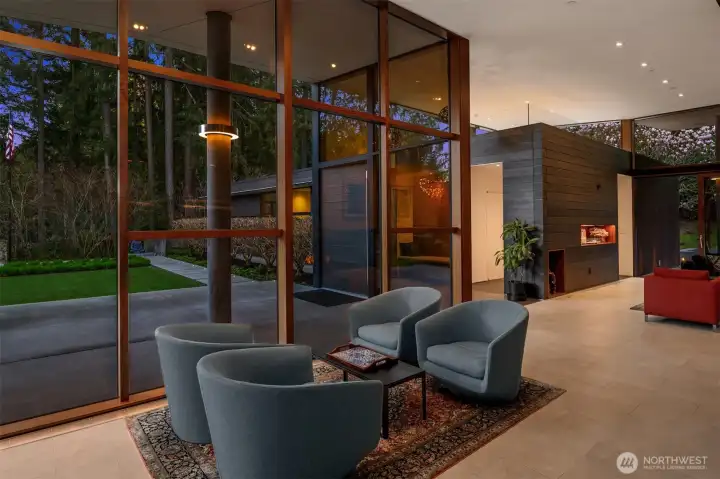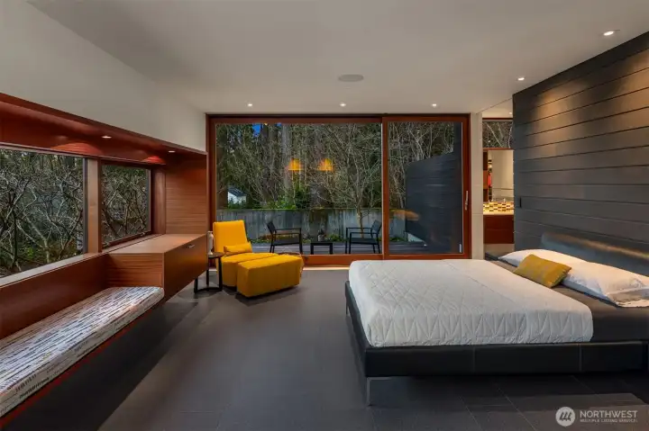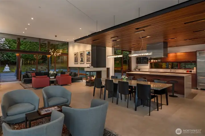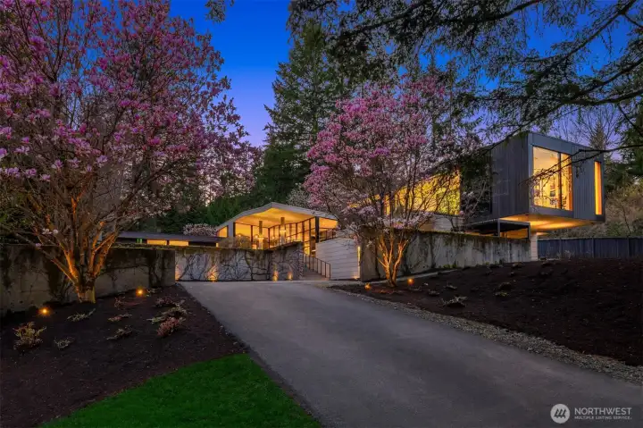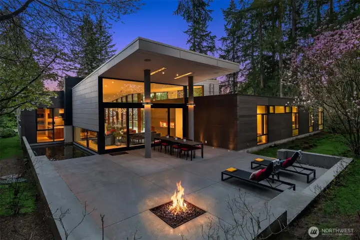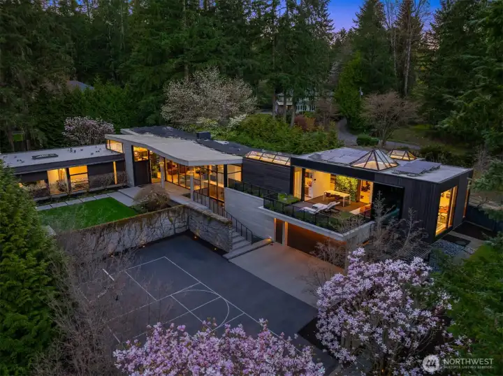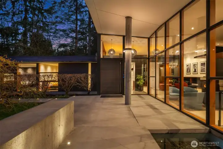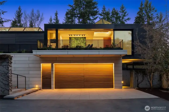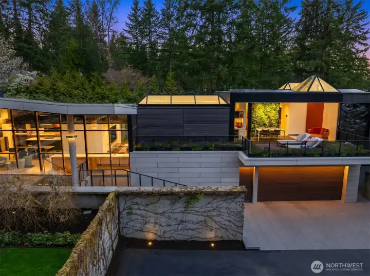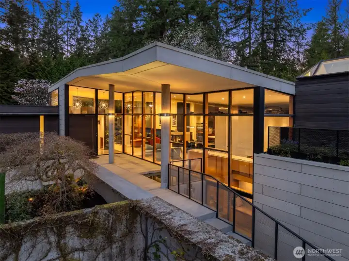 Set on a private acre among preserved native cedars, the “Inside/Outside House” is a rare modern sanctuary in Bellevue’s Bridle Trails. Designed by AIA Fellow David Coleman and realized by an elite team of regional craftsmen, this award-winning home, featured in national publications, blends striking architecture with serene livability. Three wings create a refined sense of retreat. The Living wing soars beneath a dramatic origami-inspired shed roof with 15-ft walls of glass and skylights, filling the home with natural light and forest views. The Sleep wing offers four bedrooms, including a tranquil primary suite with private terrace. The 2023 Work wing elevates daily living with a gym, infrared and dry saunas, espresso bar, office, and an interior terrace with a living green wall. An elevator seamlessly connects all levels. Interiors are defined by quiet, intentional design; pocket doors, concealed shade pockets, and integrated systems disappear from view. Materials are deliberately restrained: sapele, porcelain, and concrete flow between indoors and out; white plaster amplifies light through the darkest months; blackened steel adds depth and contrast. A suspended sapele ceiling over the kitchen integrates lighting and audio. Geothermal HVAC, radiant floors, solar with whole-home battery backup, and irrigation well reflect thoughtful sustainability. Gated, private, and minutes to Microsoft and DT Bellevue - this is modern living at its most refined. Offered fully furnished.