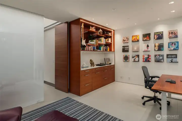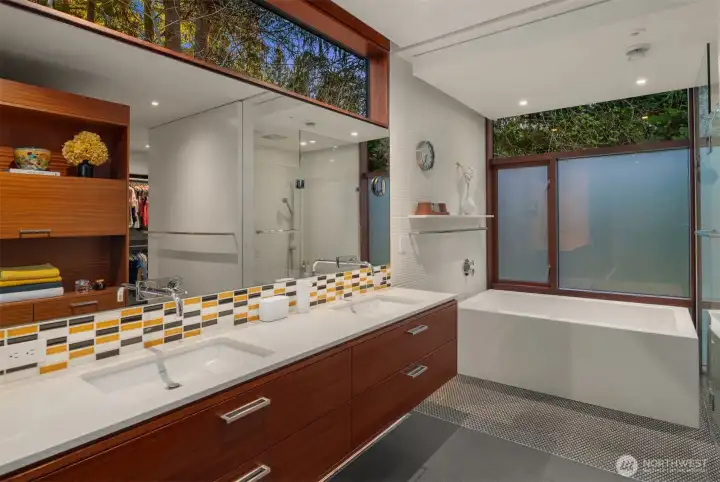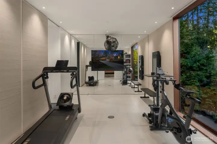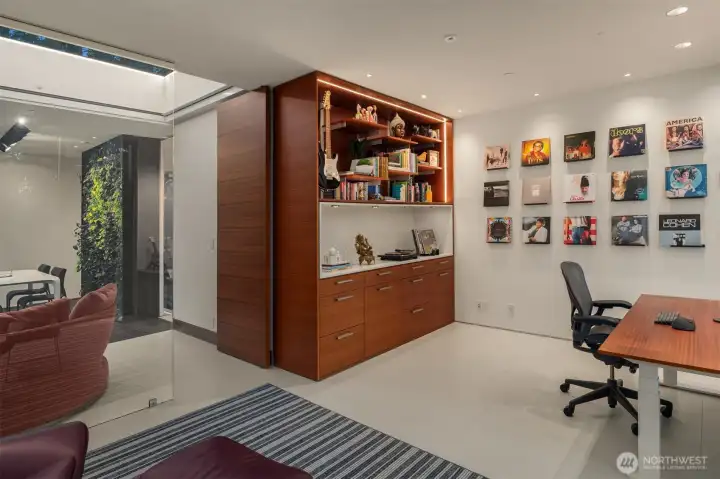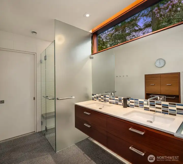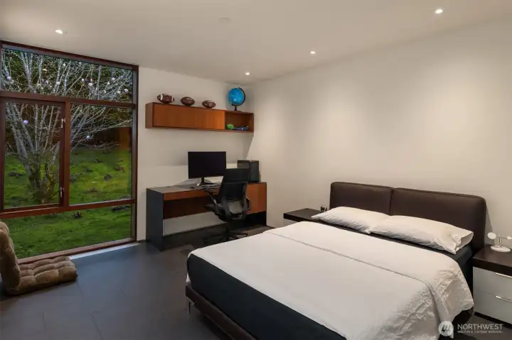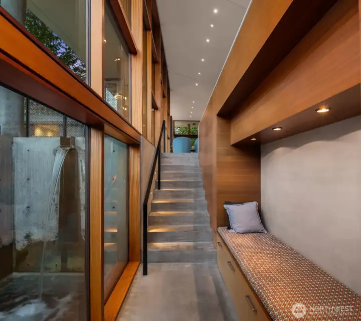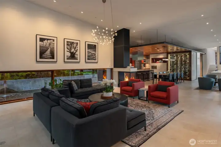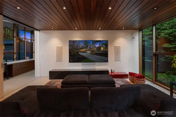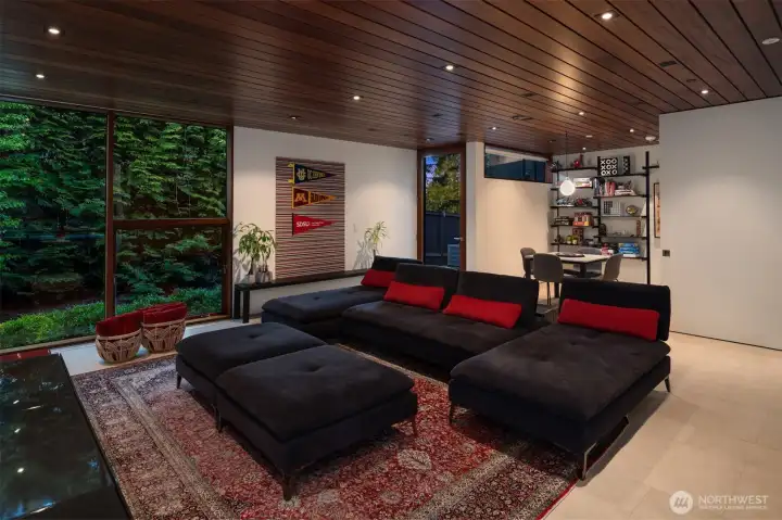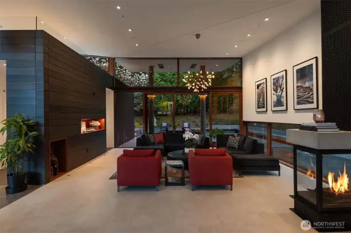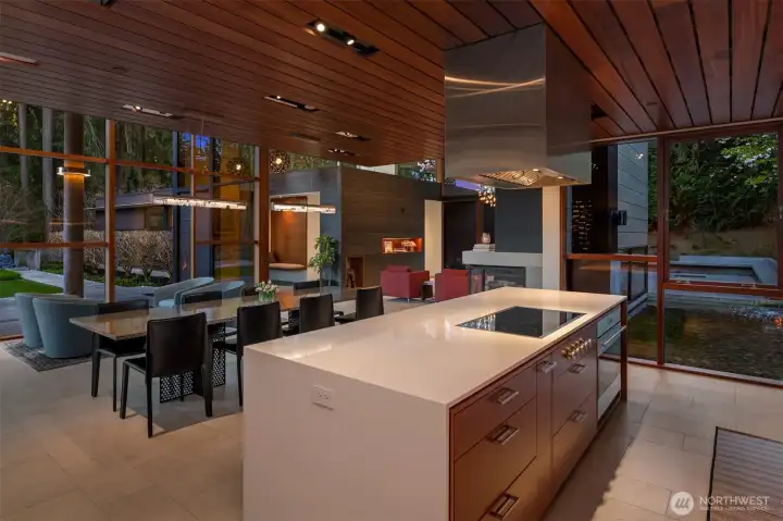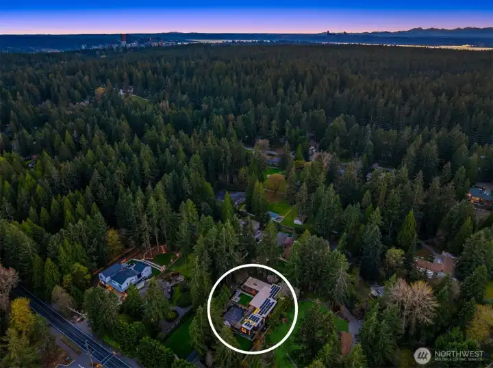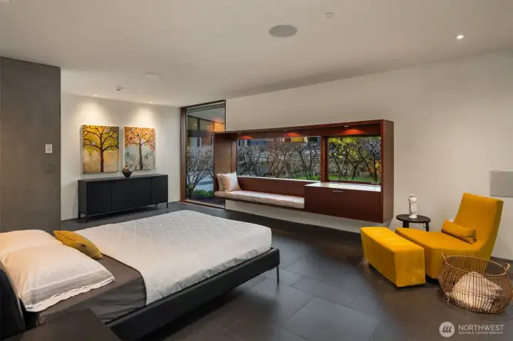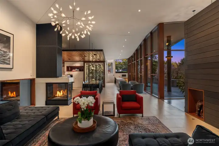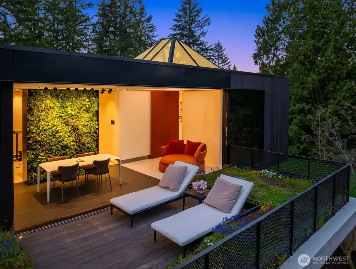 Set on a private acre among preserved native cedars, the “Inside/Outside House” is a rare modern sanctuary in Bellevue’s Bridle Trails. Designed by AIA Fellow David Coleman and realized by an elite team of regional craftsmen, this award-winning home, featured in national publications, blends striking architecture with serene livability. Three wings create a refined sense of retreat. The Living wing soars beneath a dramatic origami-inspired shed roof with 15-ft walls of glass and skylights, filling the home with natural light and forest views. The Sleep wing offers four bedrooms, including a tranquil primary suite with private terrace. The 2023 Work wing elevates daily living with a gym, infrared and dry saunas, espresso bar, office, and an interior terrace with a living green wall. An elevator seamlessly connects all levels. Interiors are defined by quiet, intentional design; pocket doors, concealed shade pockets, and integrated systems disappear from view. Materials are deliberately restrained: sapele, porcelain, and concrete flow between indoors and out; white plaster amplifies light through the darkest months; blackened steel adds depth and contrast. A suspended sapele ceiling over the kitchen integrates lighting and audio. Geothermal HVAC, radiant floors, solar with whole-home battery backup, and irrigation well reflect thoughtful sustainability. Gated, private, and minutes to Microsoft and DT Bellevue - this is modern living at its most refined. Offered fully furnished.