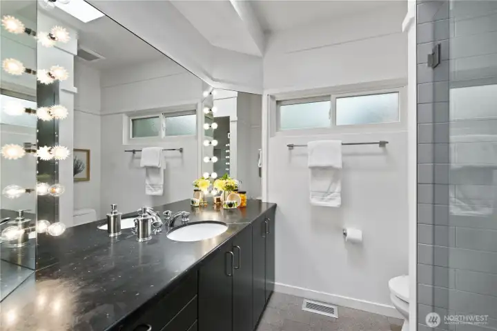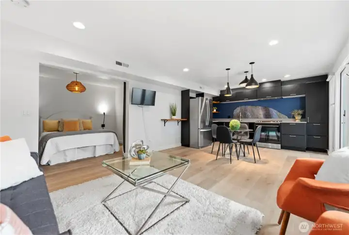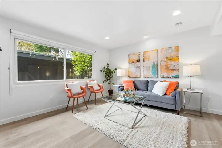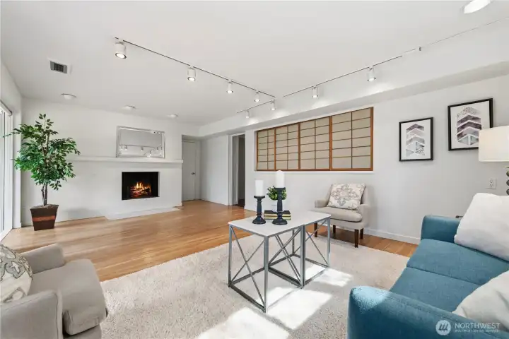 Tucked into a quiet Mid-Island enclave of just 10 homes with a private shared community pool, this classic midcentury modern offers timeless design. Sunlight beams into this home from the numerous walls of windows, creating a bright and inviting atmosphere throughout. This 2,840 sq ft residence features 3 bedrooms and 2.25 bathrooms. A spacious primary suite includes dual closets and a private ensuite bath. The light-filled main level showcases hardwood floors, a wood-burning fireplace, and a dramatic wall of windows that opens to a large deck—perfect for indoor-outdoor living. The kitchen offers abundant storage, an eat-in area, and seamless flow to the dining space. Downstairs, a walk-out lower level features a second fireplace, expansive windows, and a flexible bonus room ideal for a home office or gym. A standout feature is the attached 1-bedroom apartment with its own kitchen, living and dining areas, walk-in closet, updated tiled 3/4 bath, and in-unit washer/dryer—ideal for guests, rental income, or multigenerational living. Additional highlights include air conditioning, a 2-car carport with EV charging, and two large storage rooms. The fully fenced yard feels like a park-like setting with mature landscaping. Situated on a 9,630 SF corner lot with quick access to I-90 and top-rated Mercer Island schools, this home blends privacy, functionality, and midcentury charm.