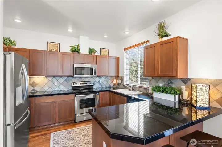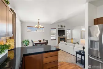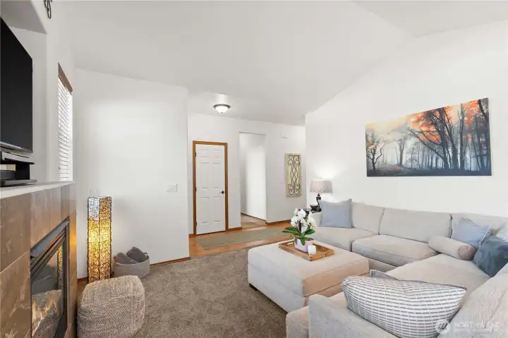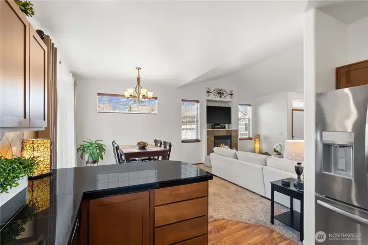 Stylish single-level condo in the heart of downtown Puyallup with an attached 2-car garage, offering the ease of low-maintenance living with thoughtful upgrades throughout. Vaulted ceilings and a cozy gas fireplace create a warm, open living space filled with natural light. The kitchen features hardwood floors, granite countertops, full tile backsplash, rich cherry cabinetry, and newer stainless steel appliances. Recent updates include fresh interior paint, brand new refrigerator, washer and dryer, new hot water heater. All bedrooms are generously sized, including a spacious primary suite with a private full bath and ample closet space. A dedicated laundry room and large hall closet add to the home’s functionality and air conditioning for year-round comfort. Step outside to enjoy a nicely sized deck overlooking your private, low-maintenance backyard with updated landscaping perfect for relaxing or entertaining. HOA maintains the front yard for easy living. Ideally located just minutes to freeways, restaurants, shopping, hospitals, and all that downtown Puyallup has to offer. Move-in ready and better than new, don’t miss this one.