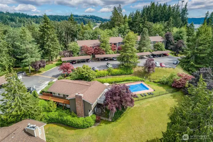 Beautiful, Turn-key, low-maintenance living just moments from the heart of Poulsbo, one of the Pacific Northwest’s most picturesque waterfront towns. Rarely do condos come available here, offering an easy, “lock & leave” lifestyle for those who value experience over upkeep. This light-filled 2BD/1.75BA home invites you to spend your weekends exploring; morning walks to coffee along Liberty Bay, browsing local markets, or enjoying waterfront dining and summer concerts just steps away. Inside, a cozy wood-burning fireplace anchors the living space, while the bright kitchen and dining area open to a private deck offering private view and large storage. All perfect for quiet mornings or unwinding at day’s end. Fresh finishes make this home truly move-in ready. Set within the Viking Crest community, enjoy resort-style amenities including pool, sauna, fitness center, clubhouse & EV charging. Covered parking included. HOA covers most utilities, making ownership simple and predictable. Whether you’re traveling, commuting via nearby Seattle or Edmonds ferries, area Bases, or simply choosing a more effortless way to live, this is a rare opportunity for affordable, strollable, Poulsbo living.