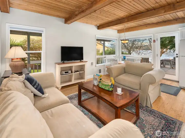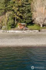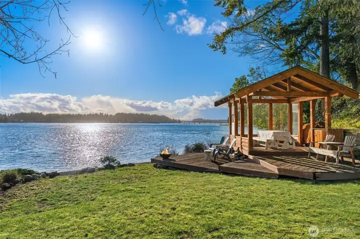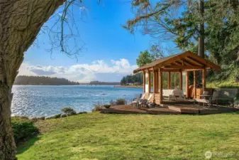 Custom Waterfront Bungalow enjoys over 90ft. of south facing prime saltwater, low bank on Hale Passage. This private charming property is a glorious retreat featuring a fantastic walking beach. Orcas do visit this passage & are always a thrill to see & hear. The covered side porch leads you to a classic single glass French door that welcomes you inside this magical Ralph Lauren style home. Wood Beam ceilings & large vinyl windows highlight & embraces the southern facing natural light. Spacious bedroom & den are located towards the north side of home for quiet time. Open kitchen off dining & living room with gas fireplace creates community. The utility space & 3/4 bath are located just off the living area & has a side door providing additional outside access. Handy out building for storage & the off street parking is appreciated. A fantastic huge patio w/built in fireplace is the heart of the property, while providing views of Hale Passage, enjoyment of the private yard, lush setting & fun times! Trail paths lead to additional covered storage & into the trees to see & listen to nature. Bulkhead has opening for easy access the beachfront. Handsome gazebo has strategically placed window panes to protect you in every season, as you look westward towards the Fox Island Bridge. Rainier & the Olympics become your best friends as you beach comb. Spacious lawn leads to the waterfront. This is an exceptional opportunity to embrace the remarkable South Sound and to own a true PNW Gem.