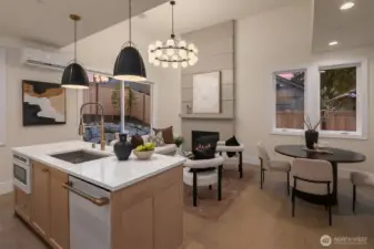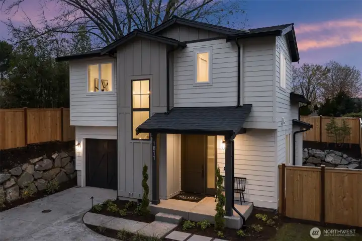 Location. Presence. Attainable. Not just a Cottage — an architectural moment quietly set within the highly desirable East of Market community. Set off a quiet, private lane serving just two homes, this one-of-a-kind residence blends refined design with effortless livability on a level lot framed by a fully fenced backyard retreat. Inside, the home unfolds with intention. A welcoming entry corridor flows seamlessly into a cozy dining area and a chef-inspired kitchen appointed with Café appliances. The Great Room commands attention with soaring 12-foot vaulted ceilings and a dramatic floor-to-ceiling fireplace — a striking centerpiece anchoring the entire living experience. Designer lighting throughout adds warmth and statement-piece finishes that elevate every corner of the home.Two bedrooms feature vaulted ceilings, while 2.5 thoughtfully designed baths showcase curated tile, statement lighting, and designer mirrors. Modern comforts elevate everyday living: toe-kick ambient lighting enhancing both the primary bath and powder room, keyless entry, EV charging pre-wired in the fully insulated garage. Walkable to Market Street, Waverley Beach, and top-ranked Peter Kirk Elementary & Kirkland Middle schools, yet tucked away for privacy — a rare balance of lifestyle and design.Thoughtfully engineered. Visually unapologetic. A distinctive East of Market opportunity priced for the real world.