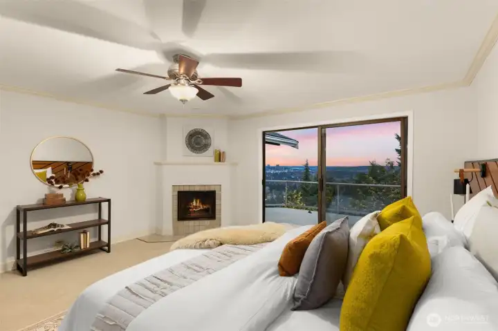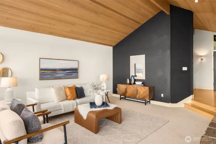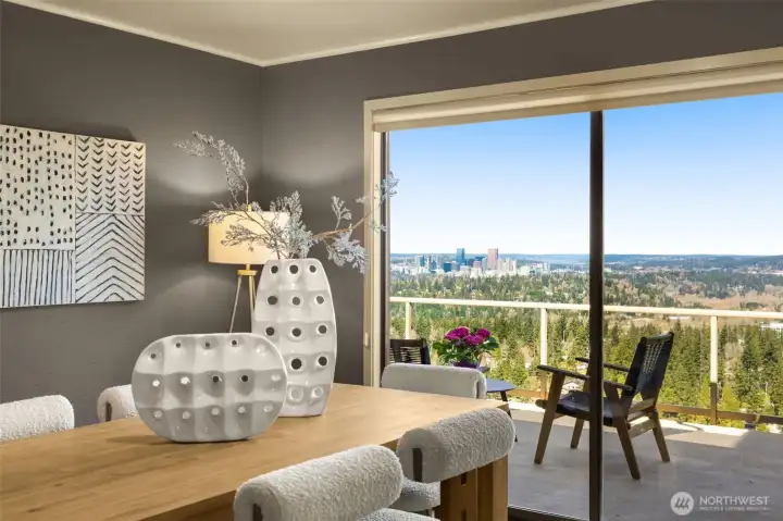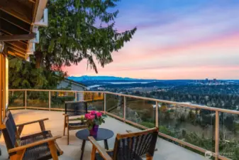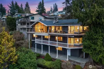 Rare Somerset view home with sweeping panoramas of Lake Washington, the Olympics & Cascades, spectacular sunset, Seattle & Bellevue skylines — enjoyed from nearly every space! Vaulted wood ceilings, a statement stone fireplace, and rich hardwoods offer a warm nod to mid-century modern design, while walls of windows frame the ever-changing scenery. Over 4,000 sqft of vacation-inspired living with a private, landscaped entry, two expansive living areas, three view decks designed for effortless indoor-outdoor living, and laundry on both levels. Entertain with ease in the spacious dining area with wet bar, or unwind in the lower level featuring a projector-ready second living room, fireplace, and built-in bar. A rare view bonus room with separate entry offers ideal flexibility for an office, gym, studio, or guest suite. The main-level primary suite is a true retreat with a 5-piece spa bath, custom walk-in closet, and private deck. The lower level features two spacious bedrooms plus a third bedroom with Murphy bed and built-in desk. Thoughtfully maintained with 2021 roof and exterior paint, plus epoxy garage flooring. Quiet, serene setting just minutes to Factoria, parks, DT, tech hubs, and top-rated Somerset Elem, Tyee MS & Newport HS. Pre-inspected. Bonus room with separate entry is unheated, not counted in total sqft.