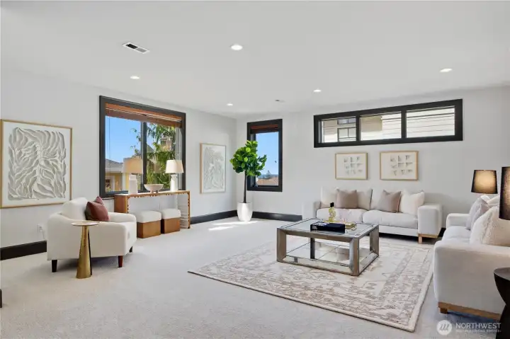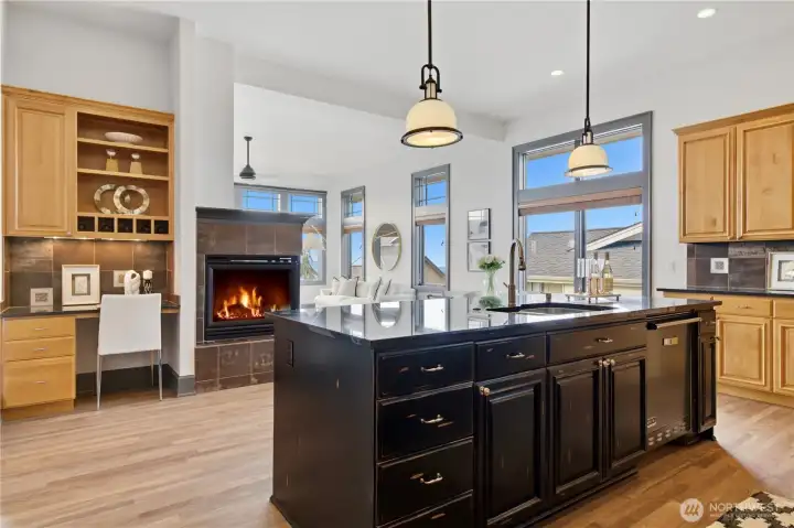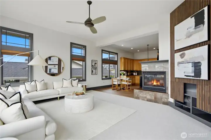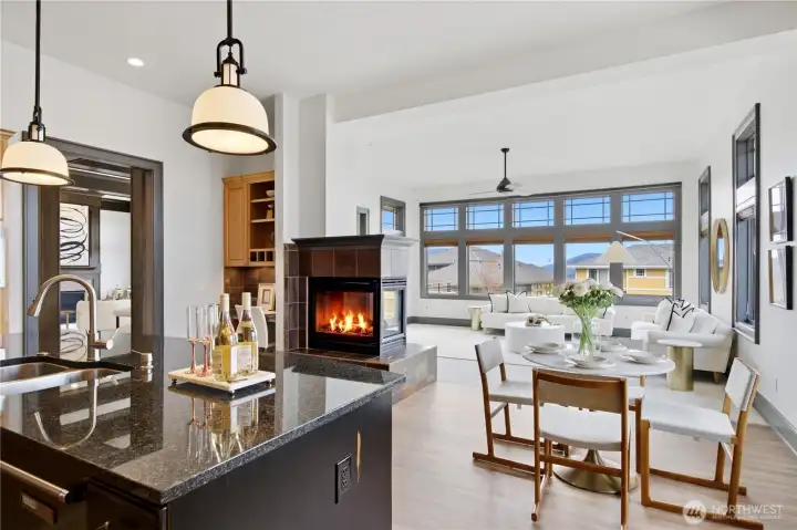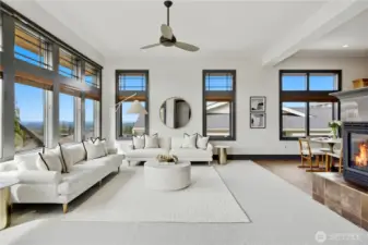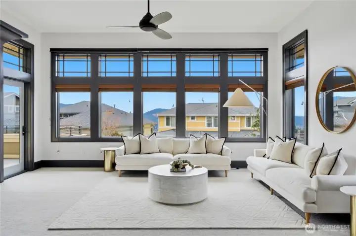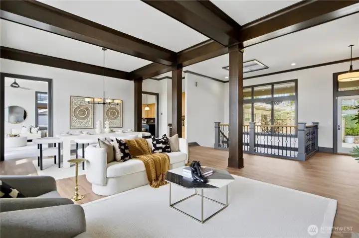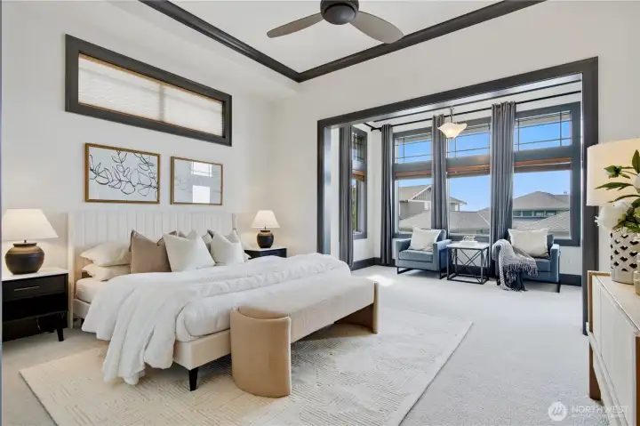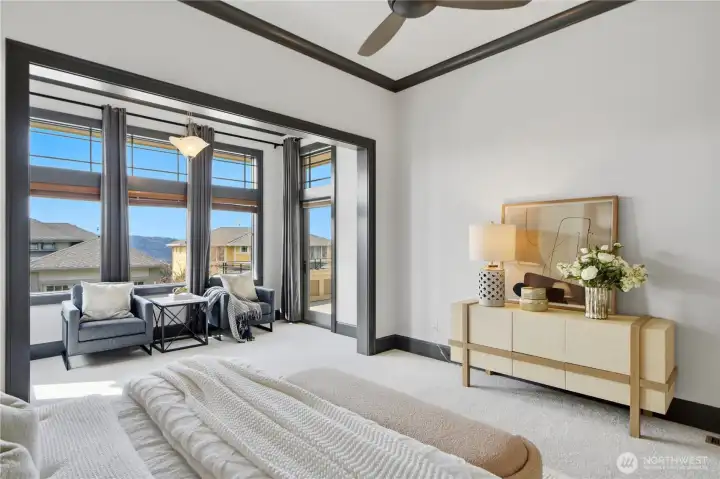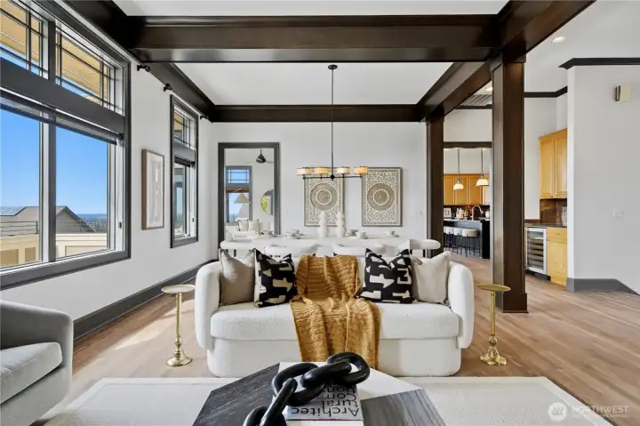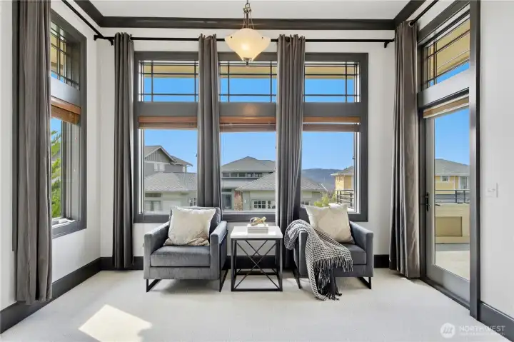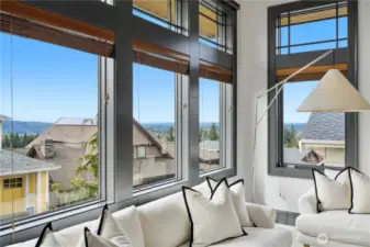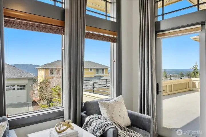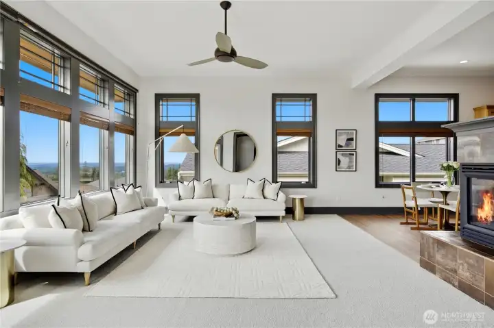 Exceptional Frank Lloyd Wright inspired home bordered by refined landscaping. Experience elevated living in this exquisite Issaquah Highlands retreat. Tucked away on a peaceful cul-de-sac, this home blends timeless elegance with modern sophistication, offering sweeping views and unmatched privacy. Soaring high ceilings, fabulous open-plan living room filled with natual lights extends to stunning view deck great for entertaining. Distinctive detailing & palette with Brazilian walnut hardwoods & contrasting charcoal gray millwork. New refinished flooring & new carpet. Gourmet kitchen: slab granite, Viking graphite gray appliances, walk-in pantry. Gorgeous primary suite w/sitting area & deck access. Lower level features 2 bedroom ensuites, spacious Bonus room/4th bedroom, wine cellar, office. Expansive driveway, 3-car garage, EV charger ready. Dog run w/turf. Nearby trails/parks. This is where luxury meets lifestyle.