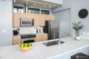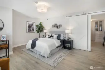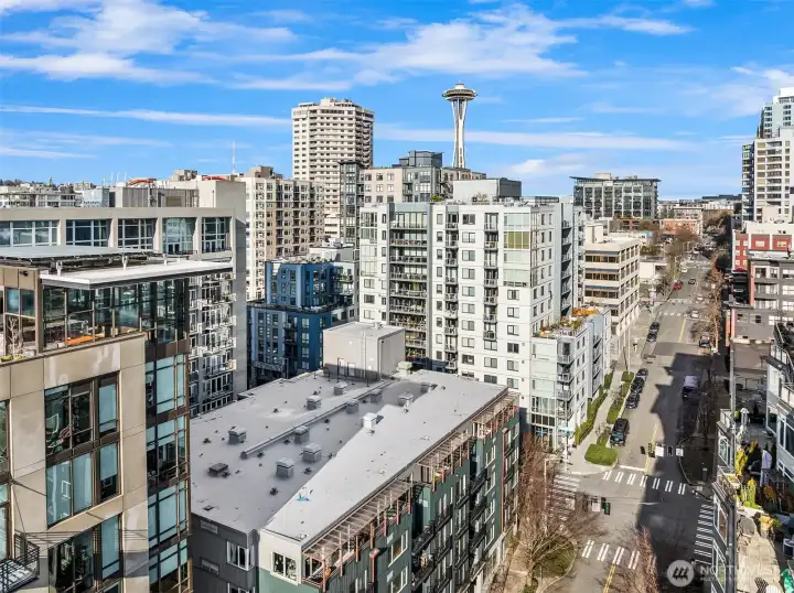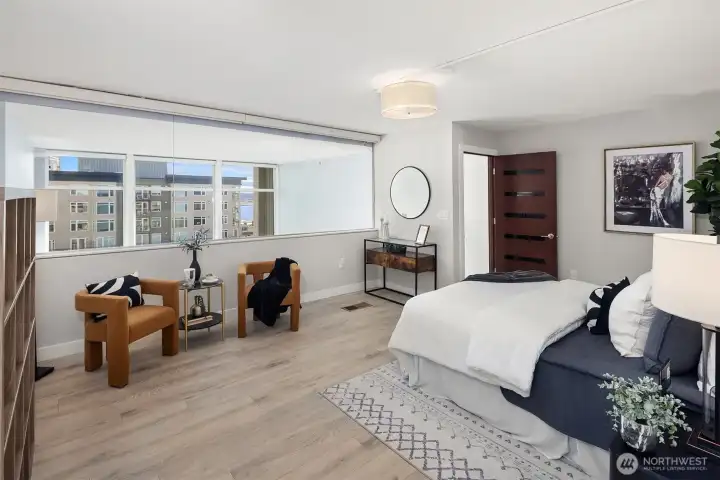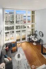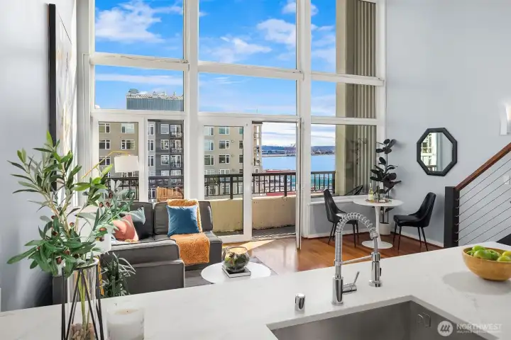 Penthouse loft with soaring 20-ft ceilings and panoramic city, Elliott Bay, and Olympic Mountain views. A rare two-story end unit on the top floor of The Klee in Belltown, Seattle. This 2-bedroom, 2-bathroom penthouse spans 1,068 sq ft across two levels. A dramatic full wall of south-facing windows floods both levels with natural light and frames the Seattle skyline from morning to city-lights-at-night. The open main level centers on a show-stopping 12-ft waterfall quartz island with bar seating, ideal for cooking and entertaining with the city as your backdrop. Hardwood floors on the main level, spa-inspired primary bath, and a generous walk-in closet with custom built-ins. The flexible second bedroom functions beautifully as a home office, studio, or guest suite, complete with its own adjacent full bathroom. Perfect for remote work or hosting visitors without sacrificing privacy. The Klee offers 24-hour concierge, fitness center, business center, guest suite, garden terrace with gas grills, EV charging, and secure garage parking with bike storage. Pet-friendly with no rental cap. No special assessments. Concrete and steel construction. Walk Score 95. Just 2 blocks to Olympic Sculpture Park, a 10-minute walk to Pike Place Market, and steps from Amazon HQ, Google, cafes, and the revitalized Seattle Waterfront.
