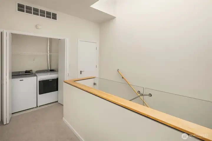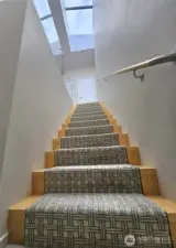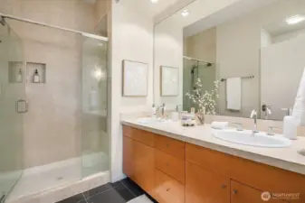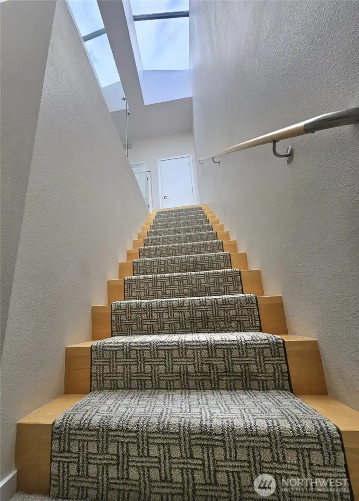 Stunning Palazzo penthouse offering exceptional light, space, and modern comfort. Floor-to-ceiling windows and a dramatic skylight fill the living spaces with abundant natural light. Thoughtfully designed Kitchen with a gas cooktop, built-in oven, granite countertops, and a walk-in pantry. Open concept living w beautiful hardwoods, gas fireplace and opens to an expansive private terrace (approx 400 sq ft) with territorial views is perfect for seamless indoor-outdoor living and entertaining. Conveniently located bathroom off living space. Both bedrooms feature brand new carpet and are situated on the upper level, each offering a private en-suite bathroom, ample closet space and its own balcony. Secure garage with two parking spaces and extra storage. Premium amenities w a full-time concierge, business center, and fitness center. No rental cap. Walking distance to shops, parks, restaurants and everything Downtown Bellevue has to offer!