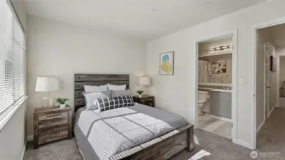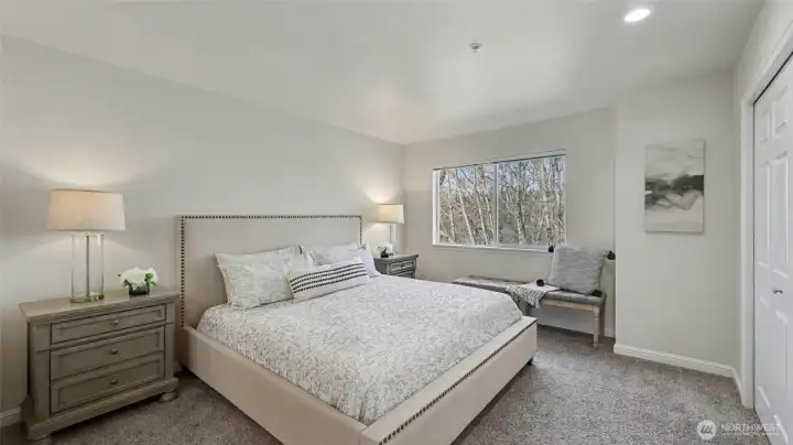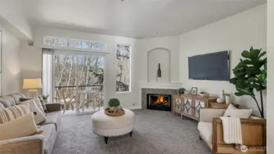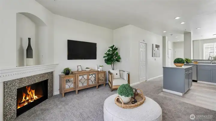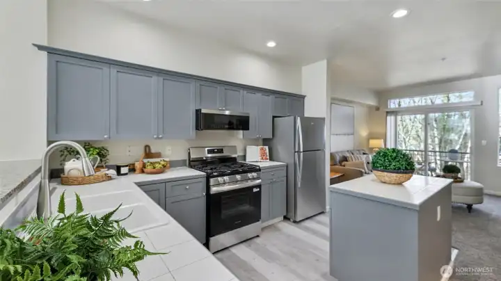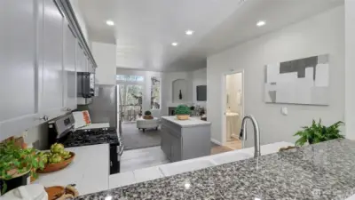 Immaculate 2-bedroom, 2.5-bath townhome in desirable Kirkland offering comfort, style, and convenience. The open kitchen features tile countertops, an island with breakfast bar, and new kitchen appliances, flowing into the dining and living areas, ideal for everyday living and entertaining. The living room is highlighted by a new gas fireplace, creating a warm and inviting space. Radiant in-floor heating, powered by a new Gas Combi Boiler for Hot Water & Radiant Heat that provides heat, keeps the home comfortable year-round. Step outside to a private deck overlooking a peaceful greenbelt with partial views of Forbes Lake. Upstairs, two spacious primary suites each feature their own en-suite bathroom, along with a washer and dryer conveniently located on the same level near the bedrooms. Additional features include secure parking for two vehicles, a storage locker, and elevator access. Residents enjoy community amenities including a fitness center, clubhouse, sport court, outdoor fireplace, BBQ area, and a scenic boardwalk to Forbes Lake. Conveniently located minutes from downtown Kirkland, Totem Lake Village, dining, shopping, parks, major tech employers, and easy access to Interstate 405. Pet-friendly up to 2 dogs/cats max 40lbs each. No rental cap and no special assessments, an excellent opportunity for homeowners or investors. Watch Virtual Tour