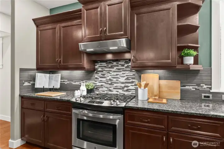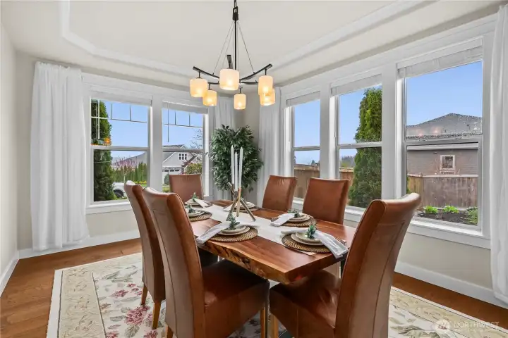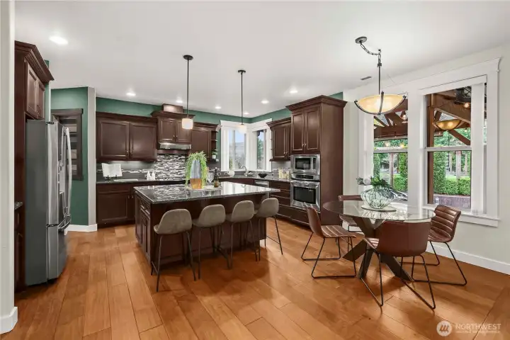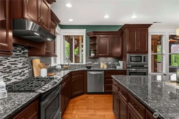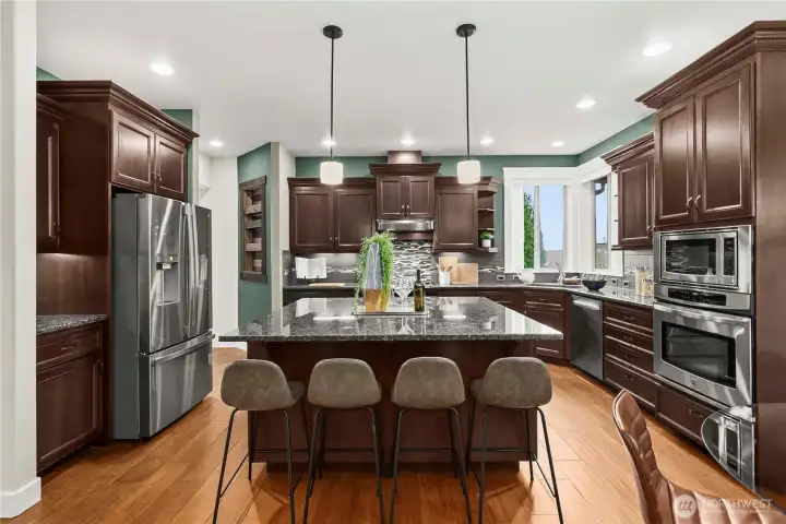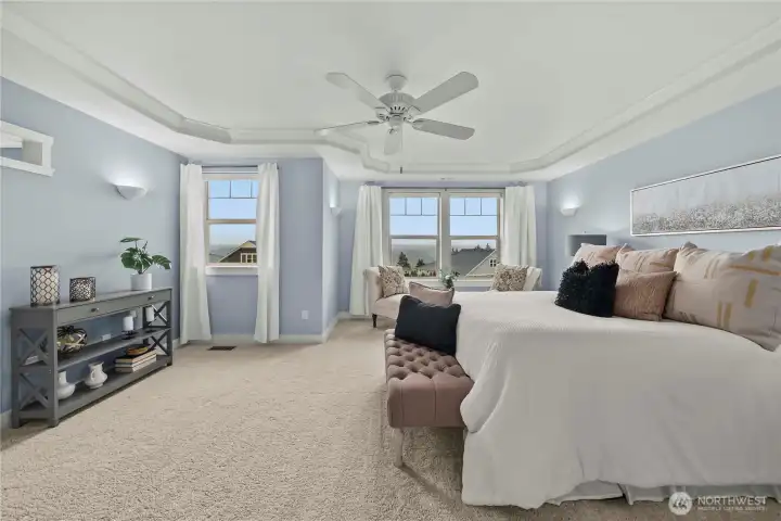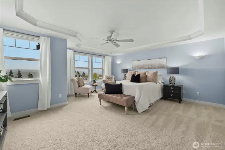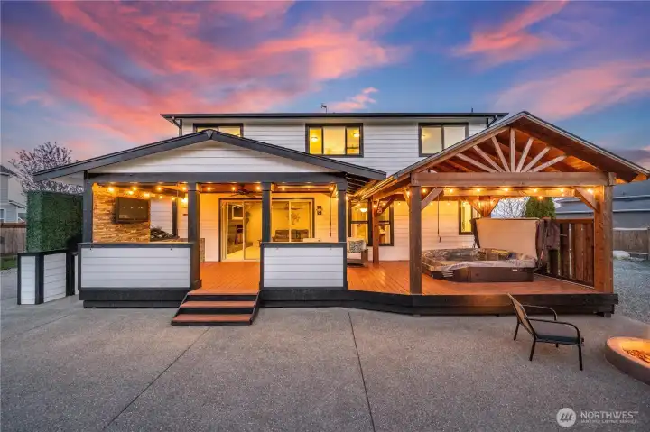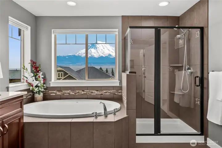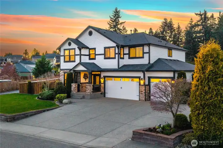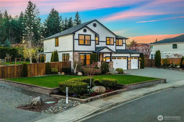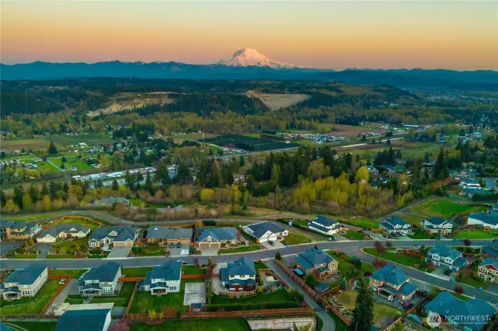 Elevated Northwest living awaits in this stunning Shawnee Ridge residence showcasing breathtaking Mt. Rainier and territorial views from a beautifully maintained nearly half-acre lot. Built in 2013, this 2,769 sq ft Craftsman offers 4 bedrooms plus a spacious bonus room, 2.5 baths, a 4-car tandem garage and ample extra parking. Thoughtfully designed with rich hardwood floors, ceramic tile, and soaring ceilings, the home centers around a gourmet kitchen featuring slab countertops, stainless steel appliances, double ovens, and butler’s pantry, flowing seamlessly into inviting living and dining spaces. The upper-level primary suite captures sweeping mountain views and includes a walk-in closet and private soaker-bath retreat. Brand new carpets and paint throughout enhance the freshness of this impeccable executive home. Exceptional park-like backyard becomes your personal sanctuary with lush landscaping and includes private covered deck, gazebo with luxury saltwater Coast Spa, gas fire pit, entertainment patio, and privacy trellis. The grounds contain multiple, raised organic vegetable gardens, 14-zone irrigation, and a professionally installed drainage system. Additional comforts include A/C, security system, and Ring doorbell with cameras — all tucked within a sought-after, secluded luxury community, just minutes from major retailers and the Foothills Trail. Live in the fresh air, high above the clouds in the valley, and secure your own private view of Mt. Rainier.