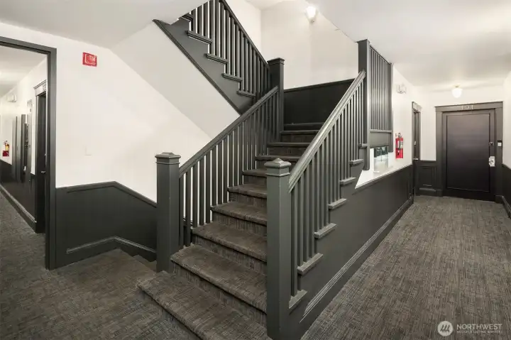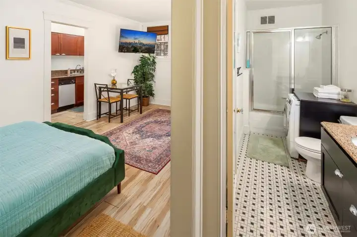 Fantastic opportunity to build your short-term rental/Airbnb portfolio with this high-demand studio condo in Belltown! Fifth Avenue Court offers owners the rare opportunity to rent their units nightly, and when you're blocks from the Spheres and the best Downtown Seattle has to offer, this unit is in demand year-round. The historic brick building welcomes residents and guests with a marbles staircase and Ionic columns; a coveted courtyard-facing unit, you can easily unwind in this quiet oasis in the heart of the city. Efficient design includes full kitchen with granite counters and gas stove, washer/dryer in unit and walk-in closet. Offered turn-key with furnishings and ready to rent for World Cup!