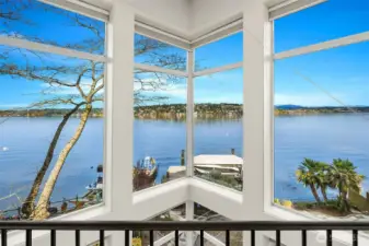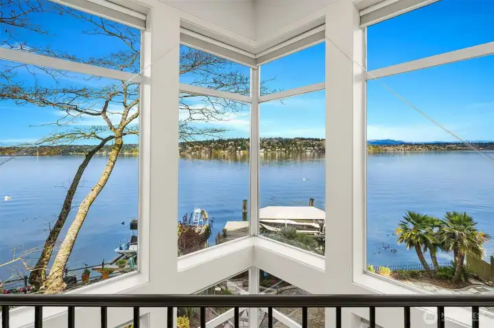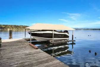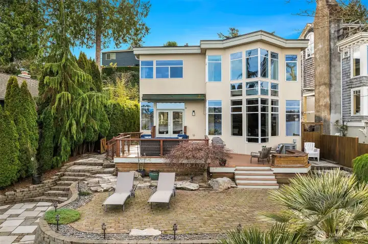 Experience lakeside living at its best in this stunning contemporary waterfront home, where panoramic views of Lake Washington and Mount Rainier meet exceptional design and effortless recreation. With 53 feet of private waterfront, a dedicated dock, covered hydraulic boat lift, and grandfathered offshore mooring pilings, this property offers unparalleled access to the lake, perfect for boating to waterfront restaurants, sunset cruises, paddle boarding and jet skiing. Architectural details shine throughout: floor to ceiling windows, angled glass, elegantly curved walls, and soaring vaulted ceilings create dramatic, light filled spaces that frame the ever-changing vistas. Luxurious finishes, including Italian marble, custom metalwork, and a chef’s kitchen enhance the home’s modern sophistication. A gas fireplace enhances the living area with warmth and year-round ambiance. A long driveway provides ample parking while adding to the property’s privacy. The expansive Trex deck and lower-level hardscaping extend the living experience outdoors, ideal for relaxing, entertaining, and taking in the tranquil surroundings. A serene water feature along the side of the home adds a calming ambiance to the outdoors. Tucked within the intimate, quiet enclave of Pritchard Island, a rare oasis on Lake Washington, this home blends privacy, convenience, and true lakeside living. A new high efficiency Furnace, newer roof and many thoughtful updates complete this exceptional waterfront retreat.
