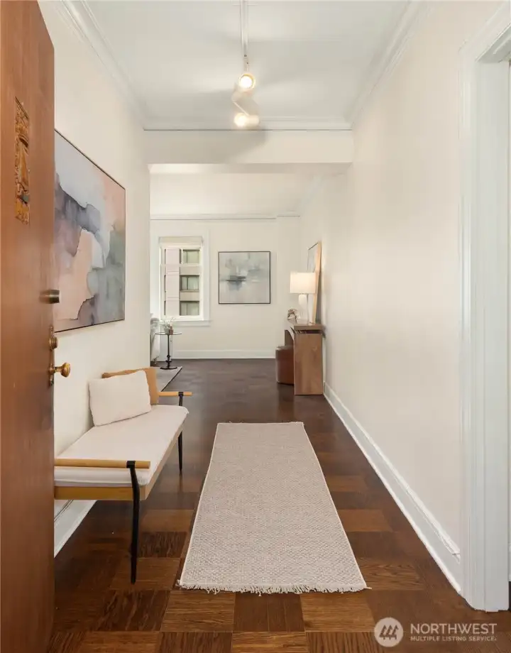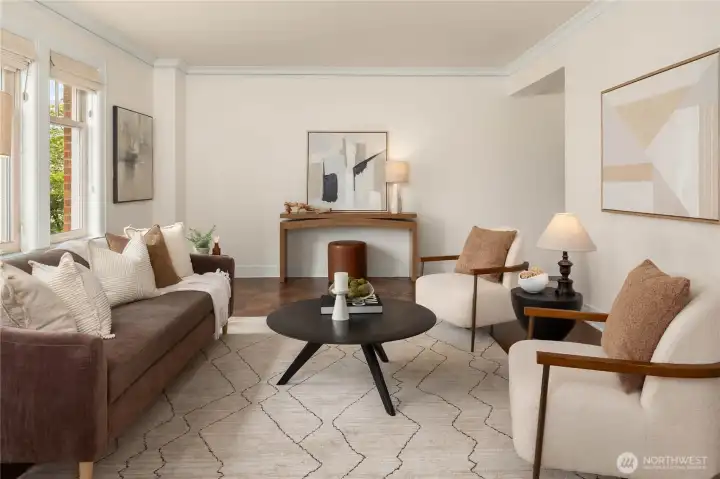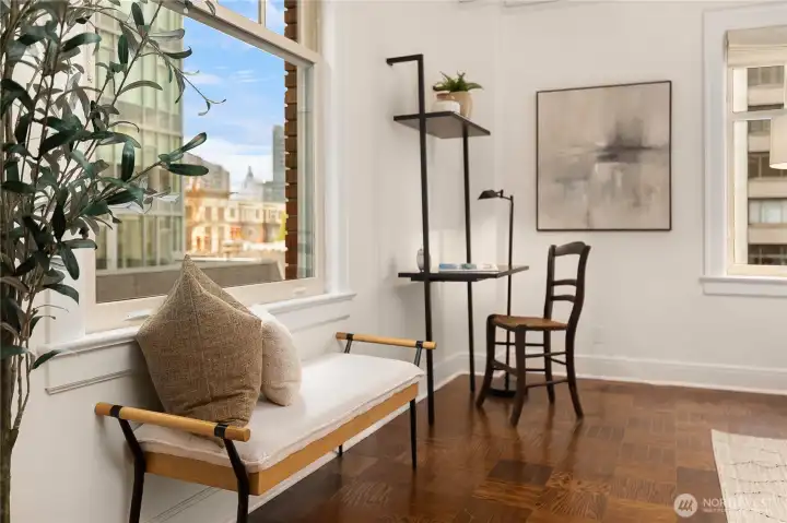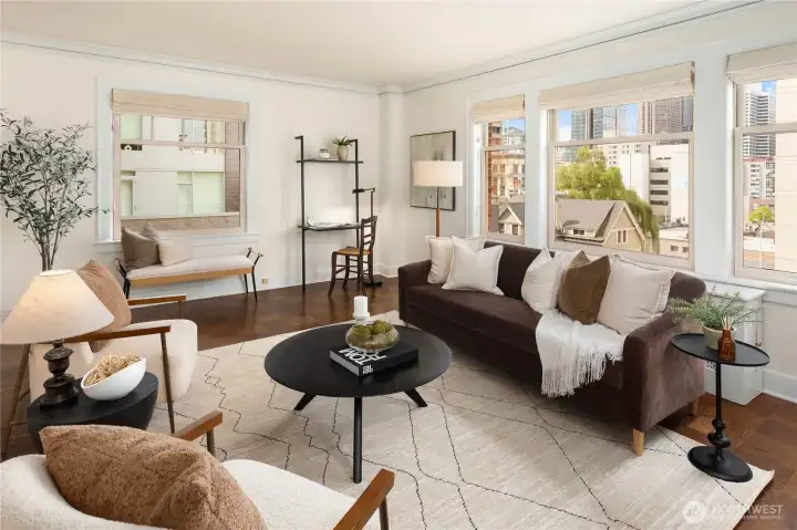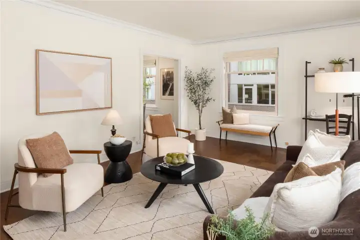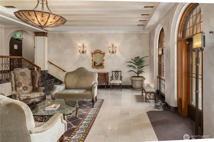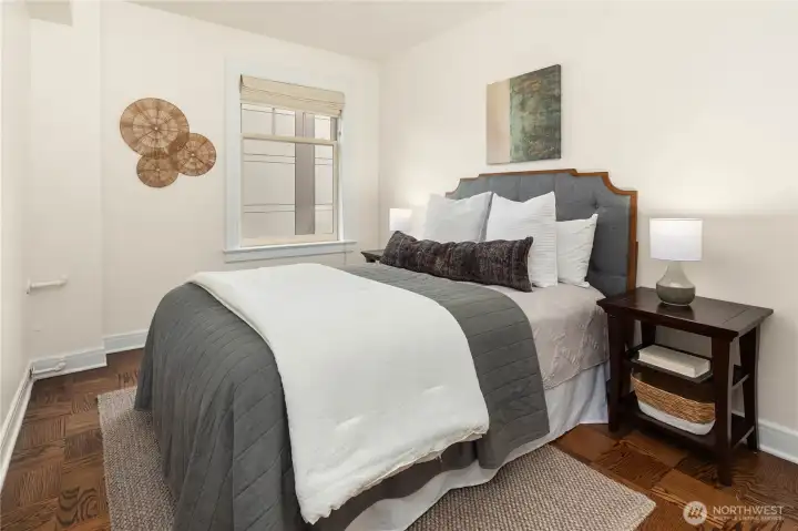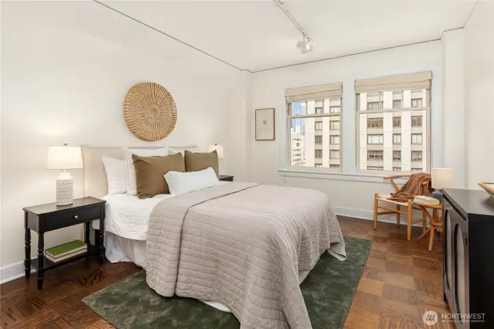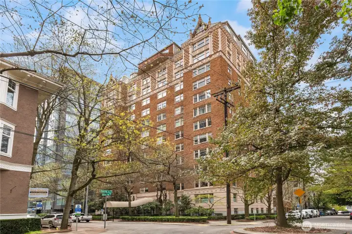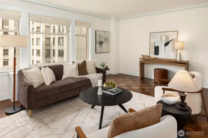 Step into timeless sophistication at The Gainsborough, an iconic residence where historic charm meets refined modern living. Rich in heritage with distinctive Art Deco character, this treasured landmark offers an elevated city lifestyle framed by elegance and authenticity. Bathed in natural light, this southwest-facing corner home showcases captivating city views, while the rooftop garden and patio unveil sweeping vistas of the city skyline, water views, and surrounding mountains. Inside, classic details blend seamlessly with thoughtful updates, including hardwood parquet floors, an updated kitchen and a formal dining room designed for memorable entertaining. Two generously sized bedrooms offer versatility for guests, a home office, or both, perfectly suited for today’s lifestyle. Everyday comforts are elevated with in-unit washer/dryer hookup in a separate storage room, secure garage parking, a dedicated mail room, and a stunning, impeccably maintained lobby that makes a lasting first impression. Constructed of solid concrete and steel, The Gainsborough exudes an old Hollywood ambiance while benefiting from significant modern upgrades, including a new roof, updated plumbing, and renovated elevators. The secure, elegant entry and well-managed building ensure both peace of mind and enduring value. Ideally located with a Walk Score of 98 and Transit Score of 99, you are just moments from premier dining, theaters, nightlife, and the best of vibrant city living.