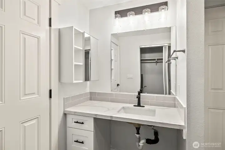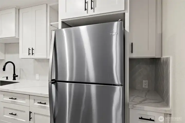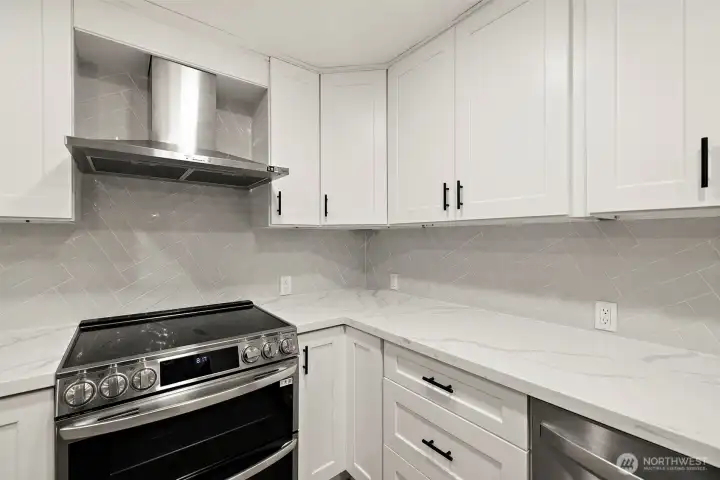 Chic and modern kitchen with Quartz countertops and kitchen island.
