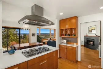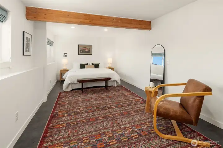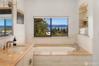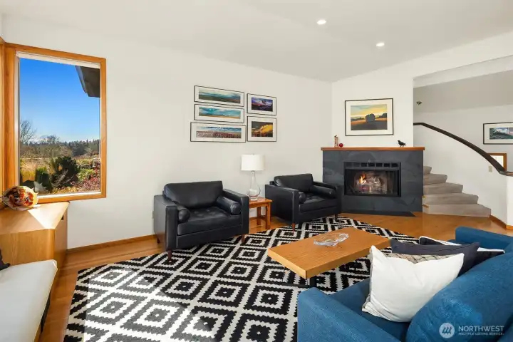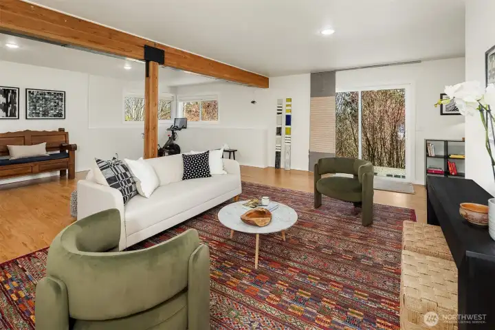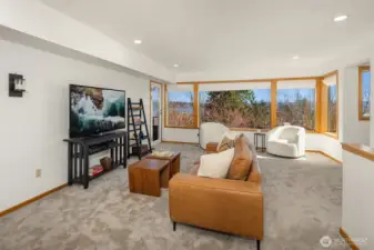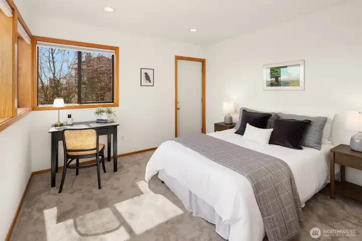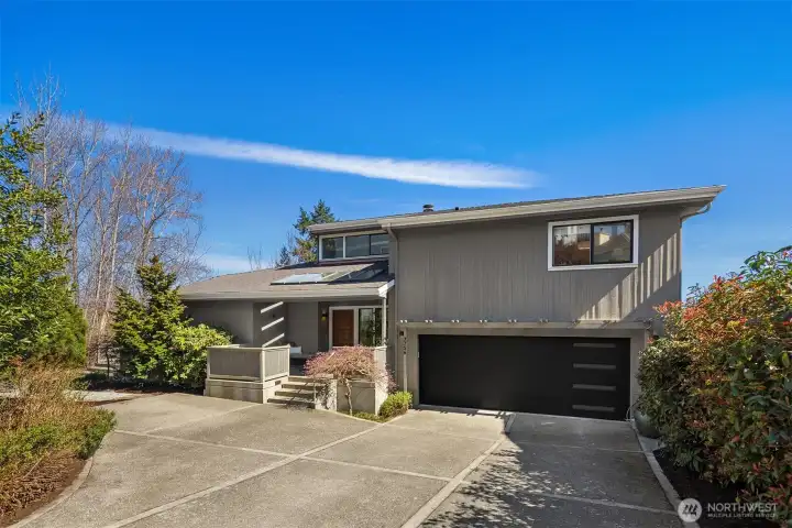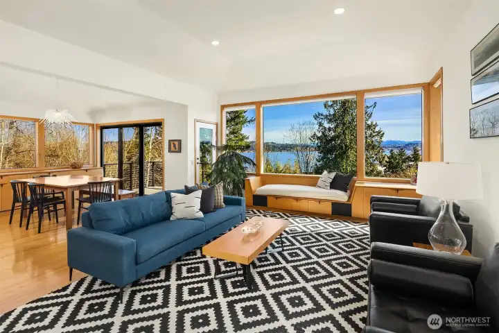 Tucked along a quiet lane, this private in-city retreat offers a rare blend of luxury and tranquility. Perched above the Burke-Gilman, Magnuson Park, and Lake Washington, the home captures sweeping lake and mountain views from nearly every level—an inspiring backdrop for everyday living. Thoughtfully refreshed, the kitchen and dining areas flow seamlessly into a light-filled living room, where soaring ceilings and expansive windows beautifully frame the surrounding landscape. Just off the entry, there is direct access to a two-car garage and an inviting den that opens to a view terrace. Upstairs, the serene primary suite is a true sanctuary, featuring stunning vistas and a spa-inspired five-piece marble bath. A guest bedroom with its own full bath, along with a conveniently located laundry room, completes this level. The mid-level is designed for connection and comfort, offering two additional bedrooms and baths, and a central family room—perfect for gathering or relaxing. In the daylight lower level, exceptional flexibility awaits, with space for a home gym, studio, theater, or countless hobbies, plus a bonus room ideal for a home office or extra guests. With a thoughtfully designed layout that balances openness and privacy, this Northwest contemporary maximizes both function and livability. Surrounded by nature yet minutes to University Village, UW, local shops, restaurants, parks, and top schools, plus an optional membership to the coveted View Ridge Swim & Tennis Club.