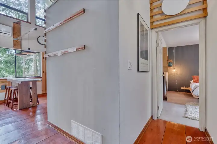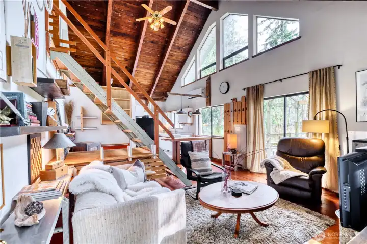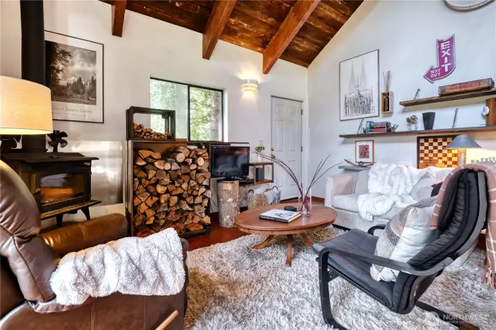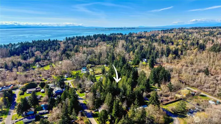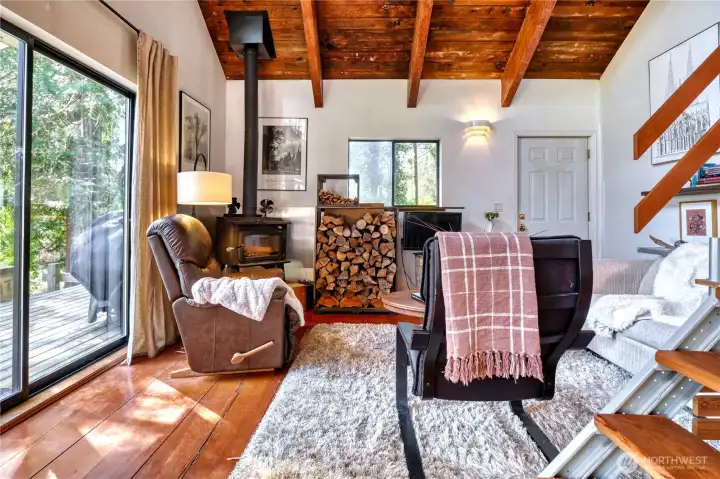 Built for full-time living in the heart of Point Roberts, this 2 bed + loft A frame offers beautiful southern exposure and a peaceful setting surrounded by evergreens. With 1,216 sq ft of thoughtfully designed living space, the home showcases classic Northwest character with soaring vaulted ceilings, exposed beams, and warm tongue-and-groove wood ceilings. Striking solid wood plank floors-milled from trees on the property during the original construction-bring natural warm history, and craftsmanship to the main living area. The open living space is bright and welcoming, with large windows that invite natural light and frame views of the surrounding trees. The loft overlooks the main living area and offers flexible space for guests, work , or cozy retreat while enjoying treetop views and open sky. Expansive decks extend the living area outdoors, crating ideal spaces for morning coffee, summer entertaining, or relaxing evenings in the quiet coastal air. Quality constructions includes a solid concrete foundation, durable cedar siding, double-pane windows, a wood stove for cozy winter nights, and a heat pump for efficient year-round comfort. Tucked into the unique seaside community of Point Roberts, the home offers a rare balance of tranquility and accessibility- approximately 45 minutes to Vancouver, BC and about two hours to Seattle.