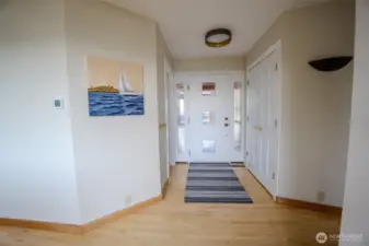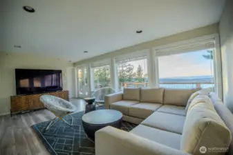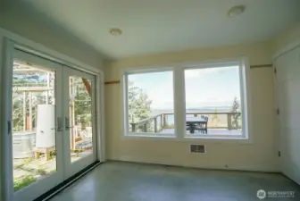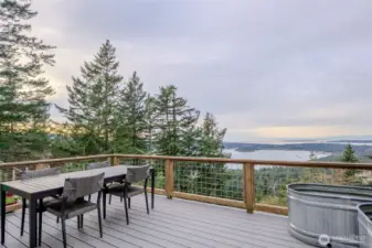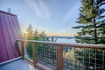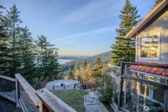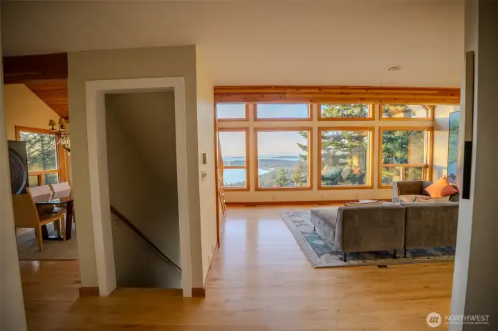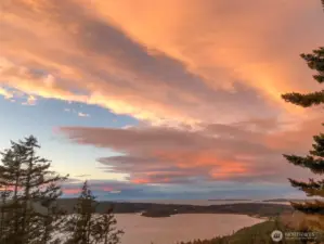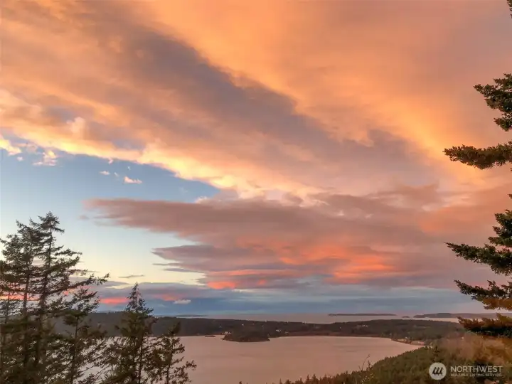 Jaw-dropping views take in the village of Eastsound and a peaceful meadow with pond in the foreground, giving way to distant islands, mountains, and the soft glow of the Canadian coastline at night. This 3-bedroom, 3-bath home on nearly 2 acres spans three levels with plenty of outdoor deck space for sunsets and entertaining. Flexible layout includes a loft primary suite with rooftop deck, main level living with high ceilings and 2 bedrooms, and a lower level great room, utility space with exterior entrance, office, and full bath, perfect for guests or creative space. Well-appointed throughout with timber frame carport, generator, fiber internet, and heat pump recently added. Conveniently located in the Orcas Highlands, minutes to Eastsound and Moran State Park.
