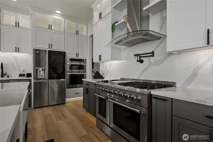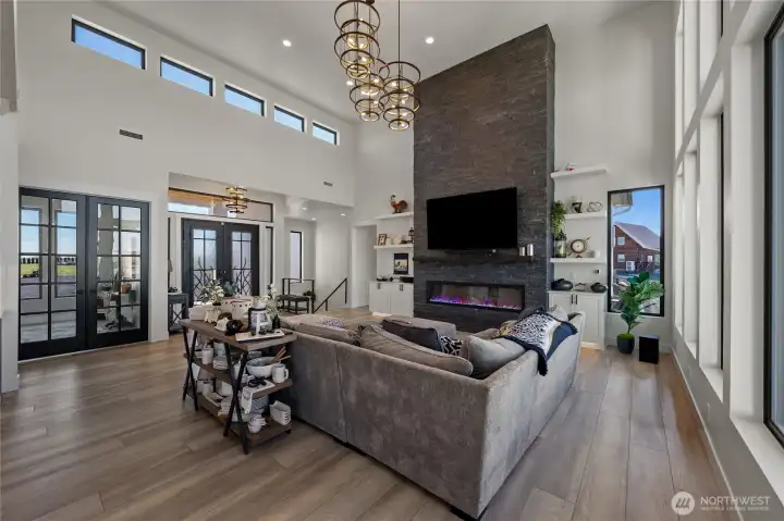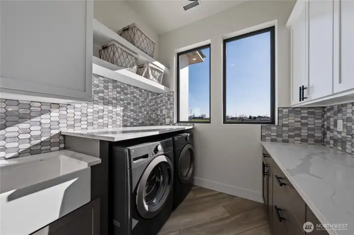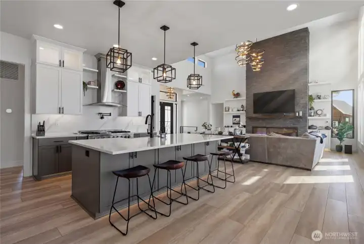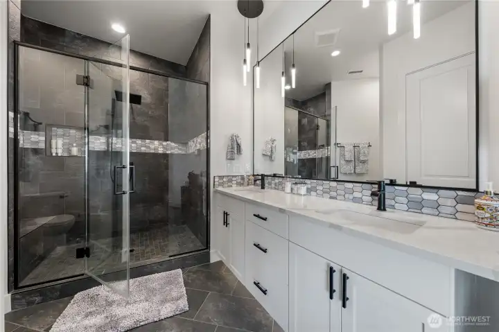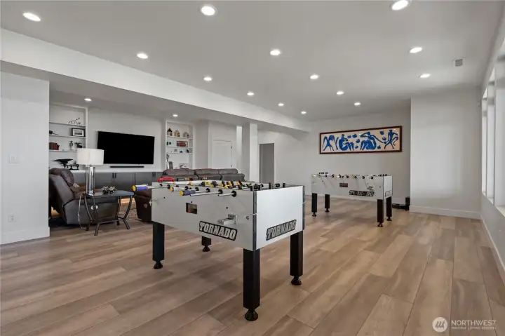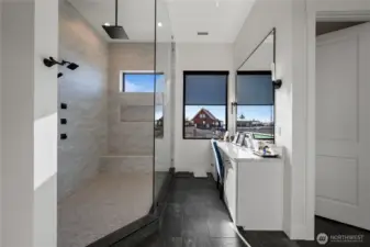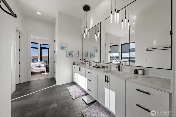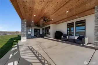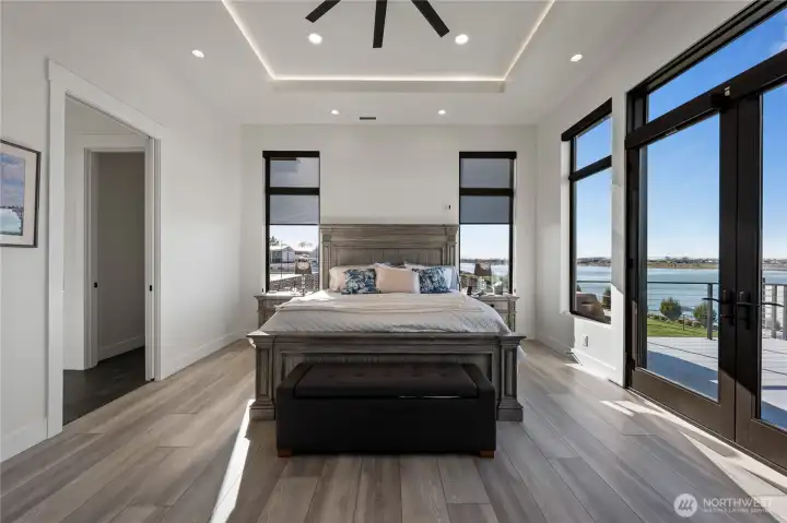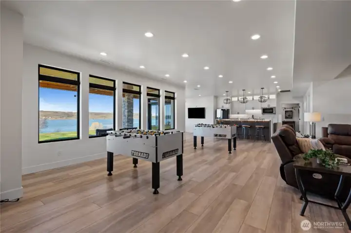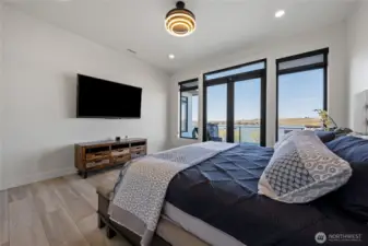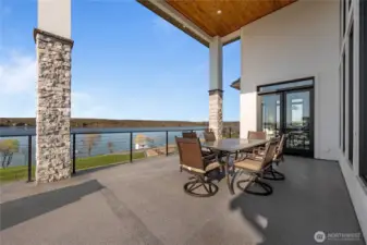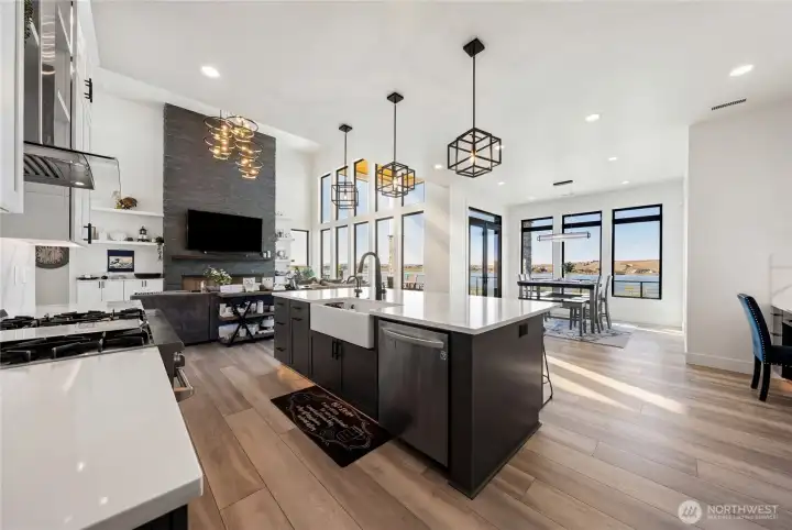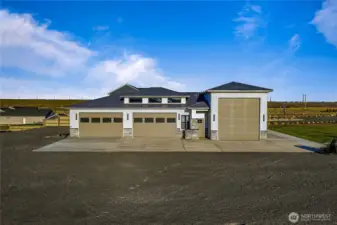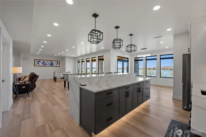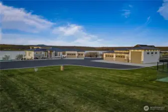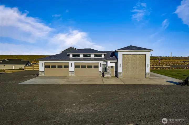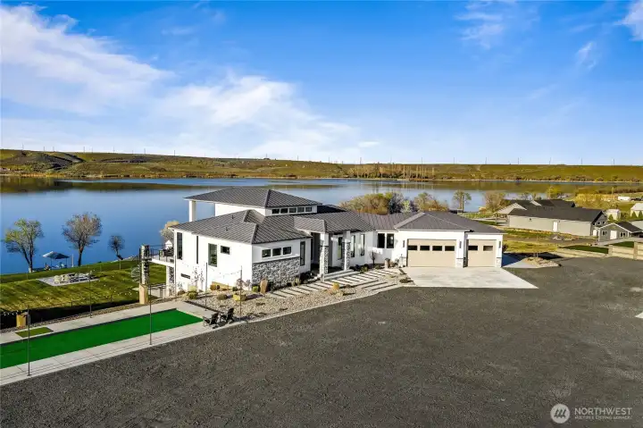 Extraordinary lakefront estate at 5874 Panorama Dr. on Moses Lake, offering a rare blend of luxury, recreation, and waterfront living. Stucco/stone exteriors with metal roof and wood soffits, manicured landscaping, curbing, irrigation, and ample lighting throughout the property. Designed for outdoor living, enjoy expansive covered upper and lower patios connected by spiral staircases, hot tub, fenced-in pickleball/tennis court, frisbee golf/bocce ball/golf areas, and grassy waterfront lawn. Shoreline amenities include a private boat launch, storage building at lake, oversized dock with boat lift, and 3-place Jet Ski lift. Detached 4-car garage with boat/RV bay and 800-amp service and 3 RV utility hookups throughout the property. Inside, refined finishes and thoughtful design continue with black-framed windows, custom cabinetry, quartz countertops, custom lighting, and designer fixtures throughout. Entertain with the chef-inspired kitchen featuring dual sinks, dual dishwashers, and double ovens. Laminate flooring flows through the main living spaces, complemented by tile baths. Each bedroom offers attached bath with tile shower and walk-in closet. Additional amenities include a main-level office, lower-level exercise room, full kitchen on lower floor, and epoxy-finished garage floors. Home is wired as a smart home with lighting and showers working on command. Custom cabinets, storage racks, custom showcase wine room with temp control. A truly exceptional waterfront retreat.
