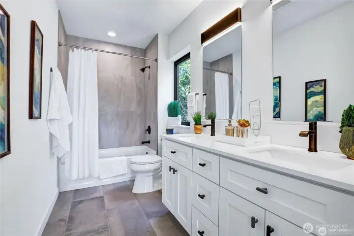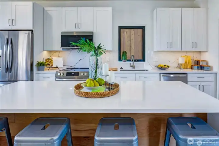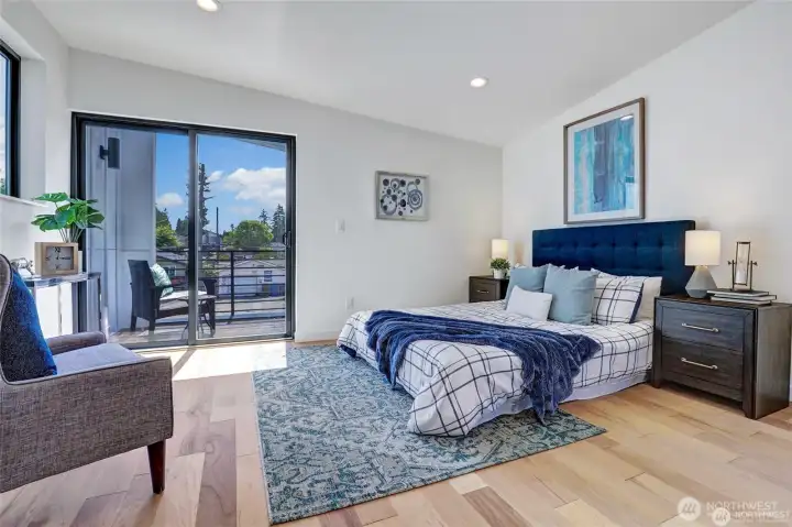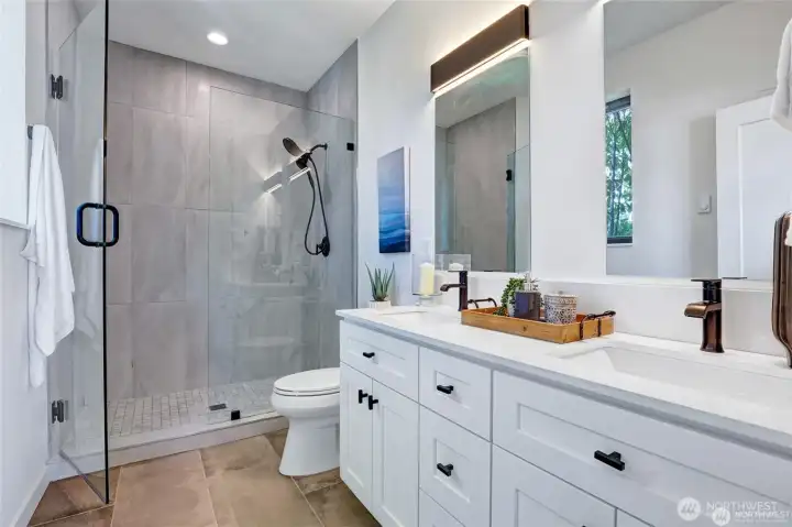 Turnkey, move-in-ready modern home in desirable North Tacoma. Ideally located near Point Defiance Park, Point Ruston, and local amenities, this home offers contemporary design paired with quality craftsmanship throughout. Spacious 3 bed, 3 bath floor plan features two primary en-suites, each with private fulls baths and balconies. The thoughtfully designed kitchen includes quartz waterfall countertops, walk-in pantry, dining area, and a dedicated workspace nook—perfect for today’s flexible living. Hardwood floors run throughout the home, enhancing its clean, modern aesthetic. Enjoy seamless indoor-outdoor living with a private fenced patio and yard, plus a BBQ ready rooftop deck showcasing sweeping Puget Sound water views—perfect for entertaining or taking in seasonal fireworks. Additional highlights include A/C, EV-ready detached garage, and an additional off-street parking space. Fully fenced with no HOA dues.