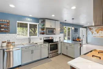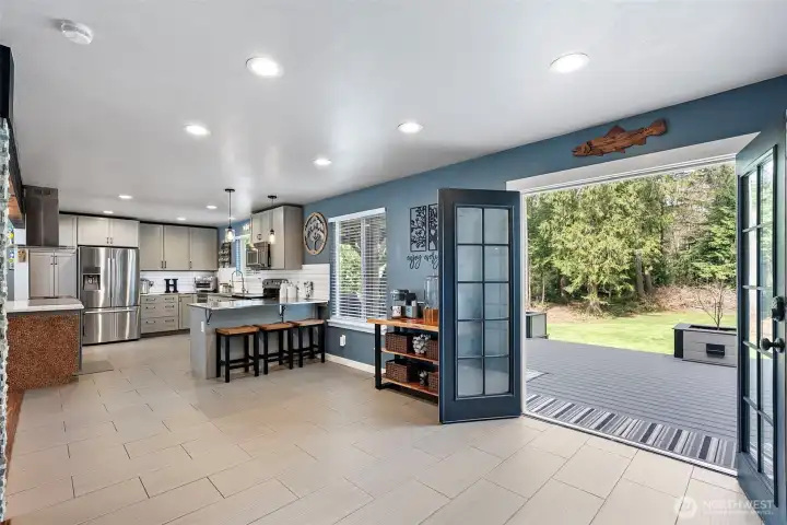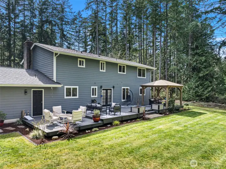 Set on 2.4 stunning acres in Olalla, just minutes from Hwy 16 and all that Gig Harbor and Port Orchard have to offer, this meticulously cared for home has been thoughtfully updated throughout and it shows! The open concept main floor offers a seamless flow between the dining, kitchen and living areas. The spacious kitchen is a standout, featuring abundant cabinetry and counter space plus a quartz island complete with built in hibachi grill and kegerator. A well appointed walk in pantry with storage cabinets and sink adds both convenience and functionality. Step through French doors to an exceptional custom 16'x56' composite deck designed for year round enjoyment. This outdoor retreat overlooking the expansive grounds includes a 12'x14' gazebo with metal roof, ambient lighting, a built in water feature and integrated planters creating a peaceful, private setting perfect for gatherings. Back inside, striking acacia floating stairs lead to the upper level where you will find a generously sized primary with en suite bath and walk in closet in addition to 2 other bedrooms, a full bath and large laundry room.The property continues to impress with a dual entry driveway offering ample parking for all of your toys and friends along with gorgeous landscaping. Additional features include an RV ready plug as well as generator wiring for added convenience. A rare combination of thoughtful upgrades, indoor/outdoor living and a prime location, this property truly has it all!