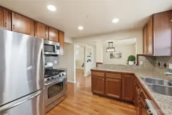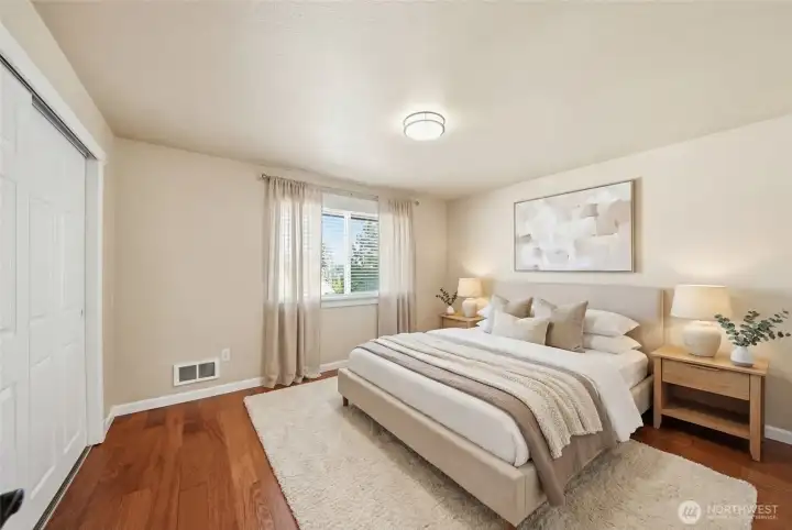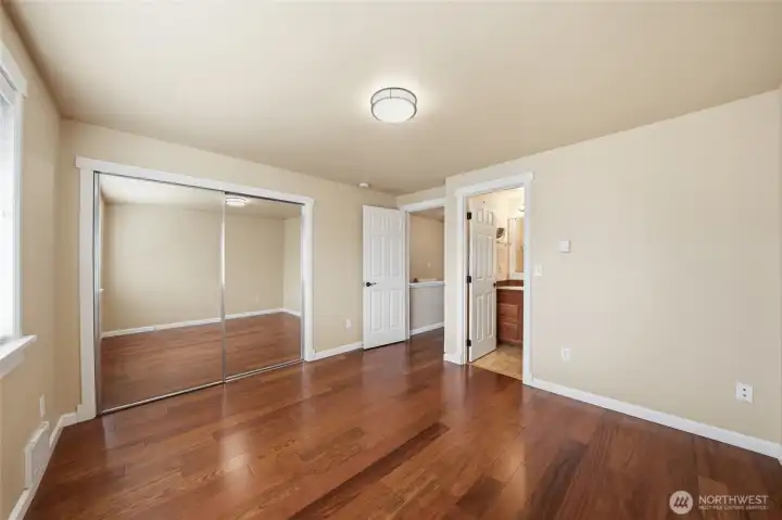 Discover the perfect blend of renovated enhancements and functional design in this stunning dual primary bedroom suite townhome. As you step inside you are greeted by the warmth of the rich extensive cherry hardwood floors throughout. The inviting main floor living area is perfect for relaxing or entertaining as the ornate corner gas fireplace adds both luxury and a perfect addition for chilly evenings. The unique layout of 2 upper level primary bedroom suites with their own attached full bath and extended closets makes it an ideal choice for roommates, guests or a high end home office setup. The open gourmet kitchen offers an abundance of counter space with granite counter tops & gas cooktop range. You will love the oversized attached kitchen adjoining walk in pantry. Transition from indoor comfort to your private fenced backyard area with large extended patio which is great for BBQs or a secure space for pets to relax. Finished floor attached garage in addition to front parking spaces. This home is tucked away in an excellent setting of only 8 townhomes that includes a large back yard park area for play time or pet exercise. Easy access to freeways and shopping, as it is a perfect commuter location.