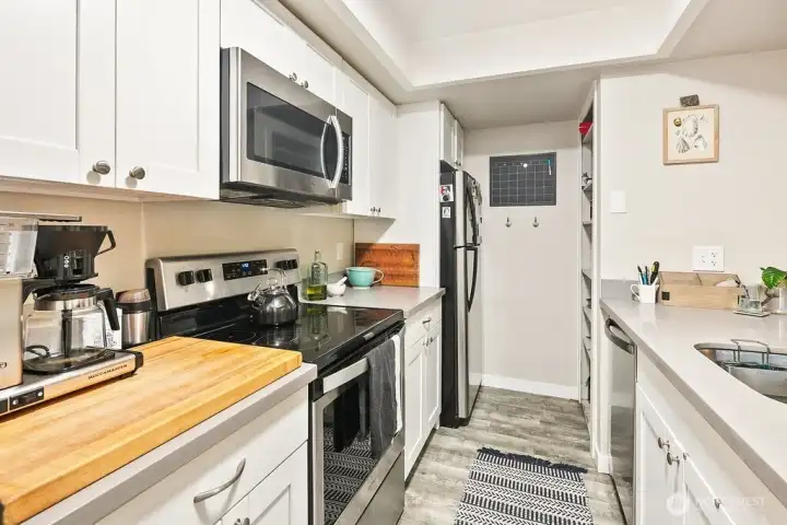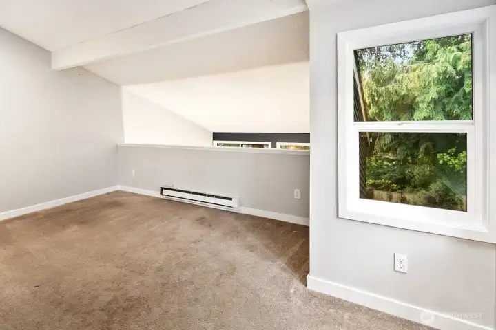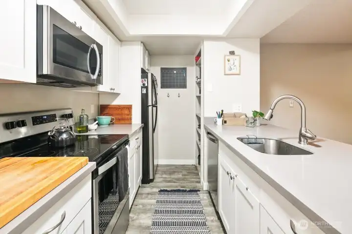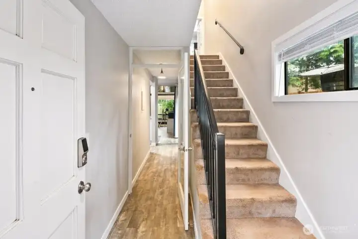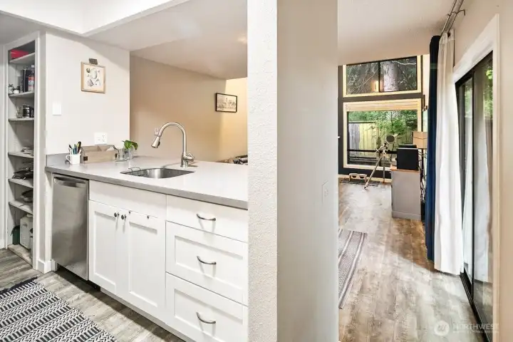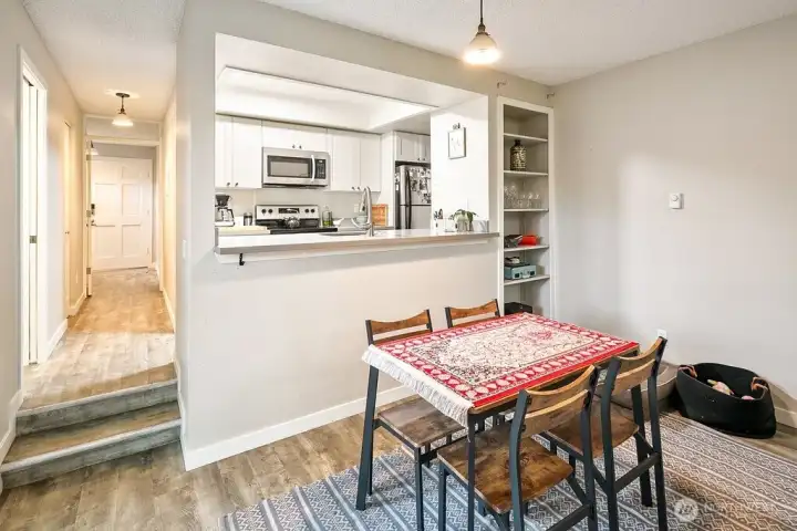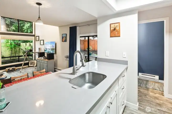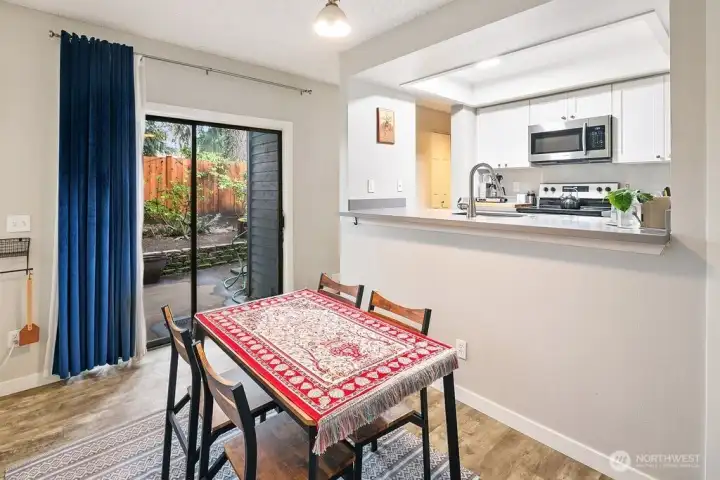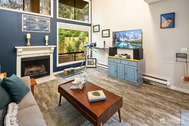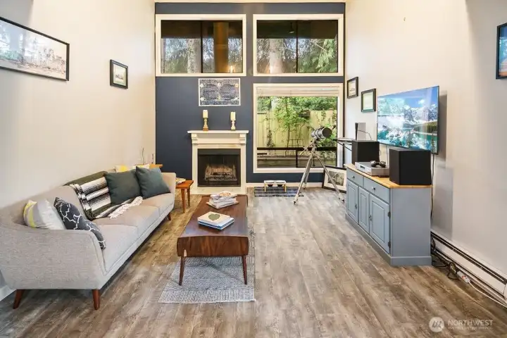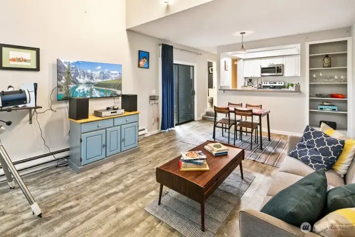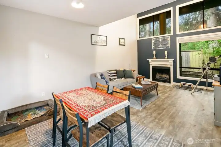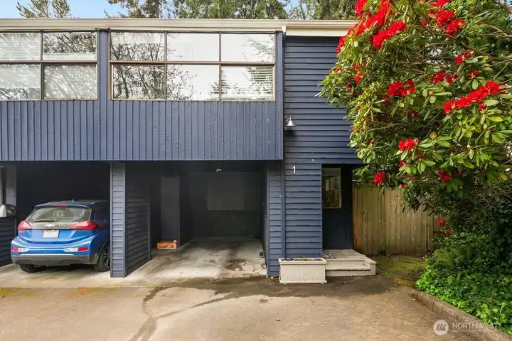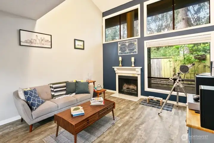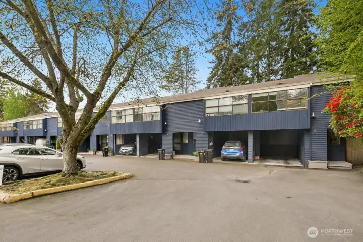 Discover easy living in this private end-unit townhome nestled in sought-after Richmond Beach. With its desirable location in the community, this home offers a quiet, tucked-away feel while still being close to everything you need. Inside, you'll find a soaring vaulted ceiling in the living room and a cozy wood-burning fireplace create an inviting atmosphere. The updated kitchen and refreshed half bath, along with newer laminate flooring, add a modern, move-in-ready touch. Upstairs features a full bath, in-unit laundry, and two bedrooms, one being a flexible loft space—ideal for a home office, reading nook, or guest area. Enjoy outdoor living on your private patio overlooking a beautifully maintained garden containers, fully fenced yard—perfect for relaxing or entertaining. With a carport just steps from the front door, everyday convenience is built right in.
