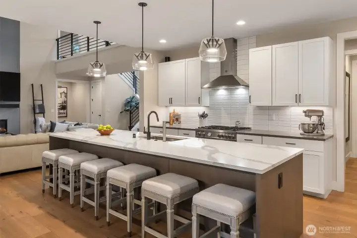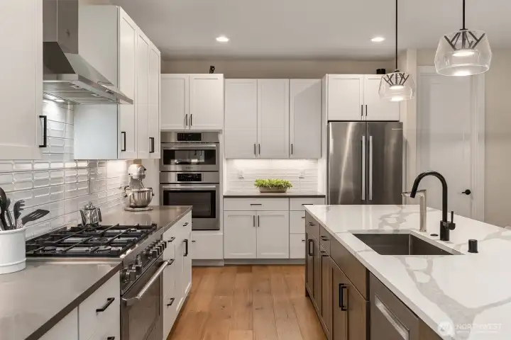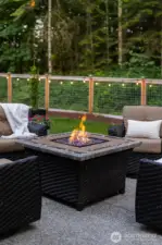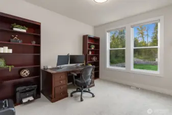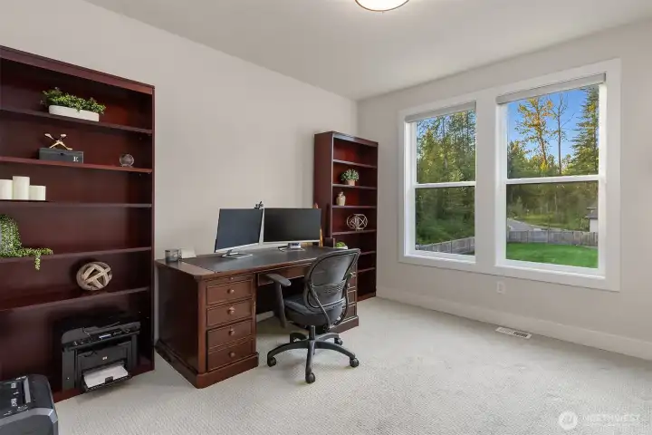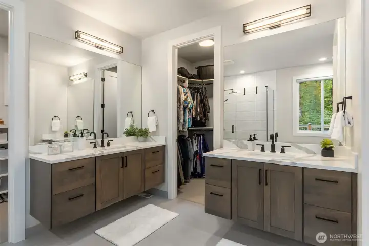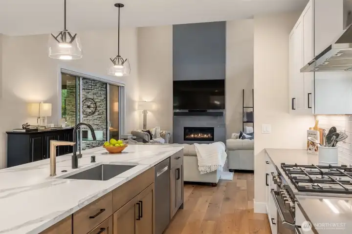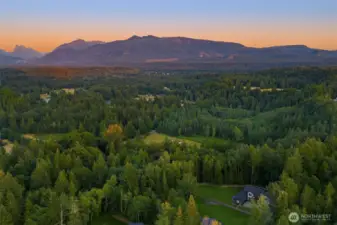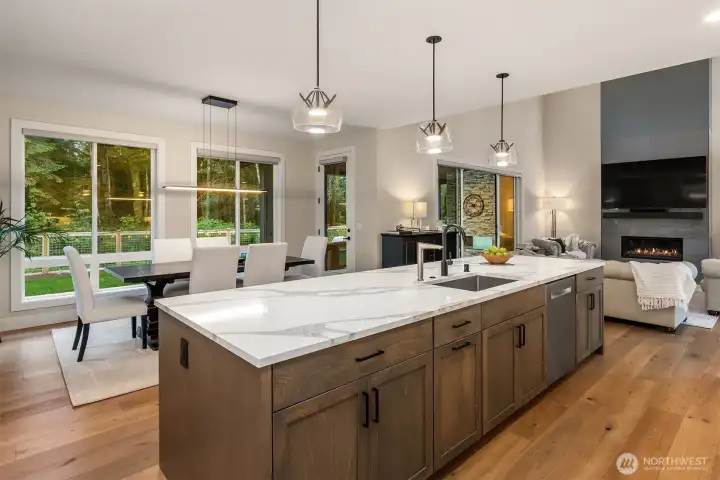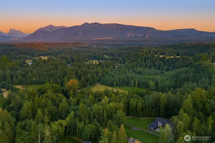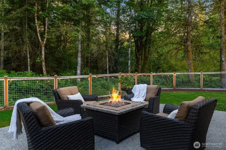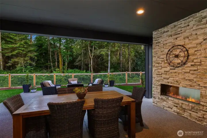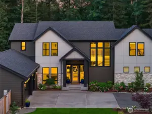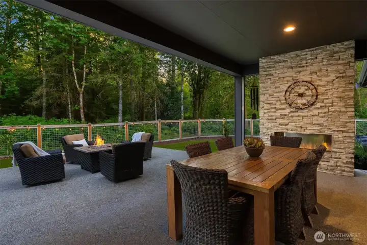 Tucked away in a quiet, private enclave, this retreat unfolds across 1.25 acres of serene, flat grounds, offering space, privacy, and endless possibility. Built just two years ago, showcasing exceptional craftsmanship, high-end finishes, and thoughtful design. Rich hardwood floors, custom details, and top-tier appliances set a refined tone. The floorplan is anchored by an impressive great room, where soaring ceilings and a dramatic floor-to-ceiling fireplace create a striking focal point. Designed for both everyday living and effortless entertaining, the space flows seamlessly into the gourmet kitchen, complete with designer lighting, premium appliances, generous prep space, and walk-in pantry. Main level offers a den/office and the stunning primary suite, positioned for privacy, featuring a spa bath and walk-in closets. A junior suite on the main floor adds flexibility for guests or multi-generational living, while upstairs you’ll find three additional bedrooms, a spacious bonus room. The great room opens to a covered patio with its own fireplace, creating a cozy, all-seasons space to entertain, unwind, or simply take in the peaceful surroundings. The level, fully fenced yard offers rare privacy and room to roam, perfect for play, gardening, or quiet moments. With its blend of modern luxury, intentional design, and Northwest-inspired living, this home is a rare opportunity to enjoy refined living in a tranquil setting where every detail has been carefully considered.