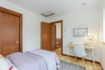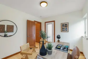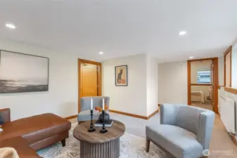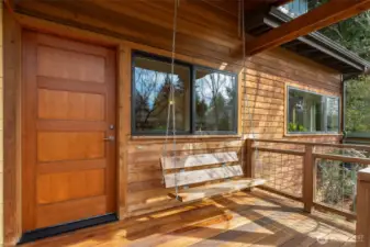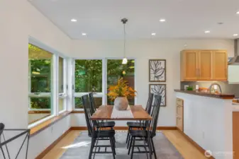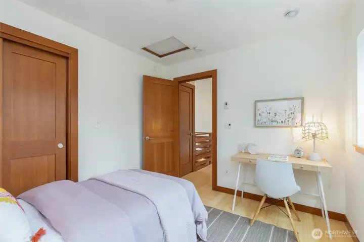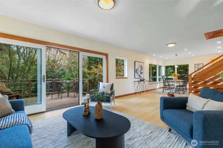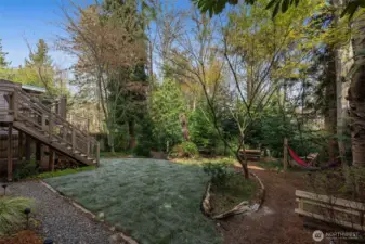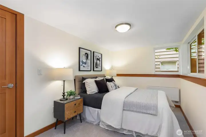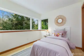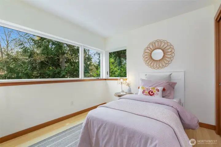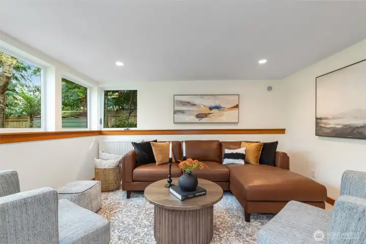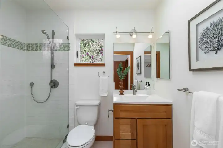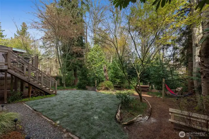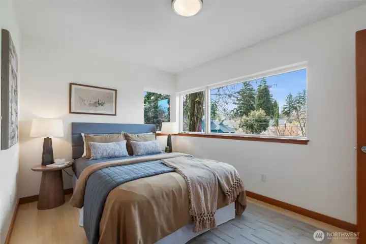 This Northwest contemporary home, a true sanctuary in the city, is an impeccable example of thoughtful design intersecting with a natural setting. This home was built with the environment in mind, made largely with locally sourced materials, is only steps from all that Wedgwood has to offer. On a lush protected greenbelt, the sweet birdsongs change with the seasons. Organic materials and walls of windows, awash in natural light, integrate the indoors to the outdoors. The combination of open concept living and comfortable, discreet spaces make this a home that will delight. The metal roof, concrete board siding, Ipe decks, 220 electric in the garage for EV, a premium HRV whole house air filtration system, and radiant heating are among the comforting and sustainable choices made in the well considered construction. There's no need to compromise. You get all of this with the perfect floorplan - 3 bedrooms and 2 baths up, 1 bedroom or office with its own entrance and a half bath on the main, and downstairs is a spacious bedroom, another bath, and a media room with a second kitchen/laundry. The downstairs can also be used as an ADU with permitting already in place and its own entrance. The gardens around the home are expansive and special, perfect for gardening, relaxation, and play. You are going to love this home and it will love you back.