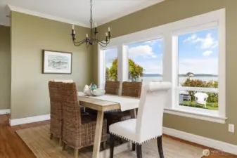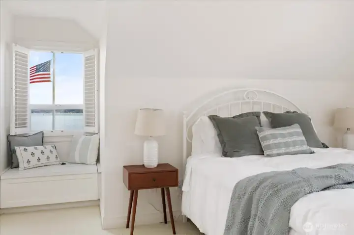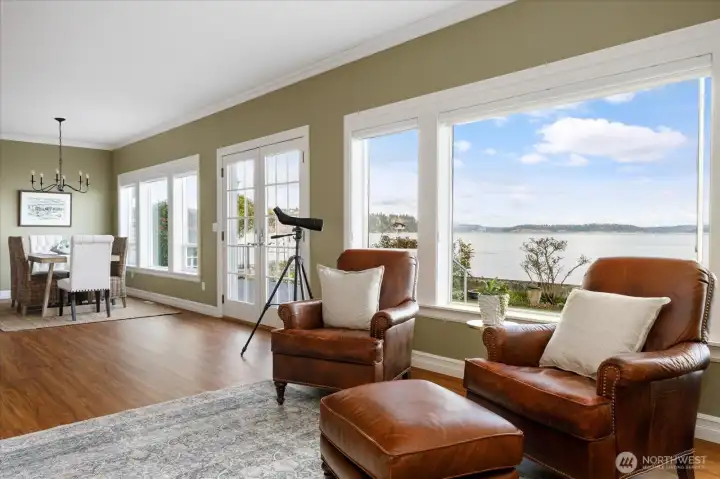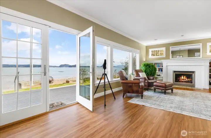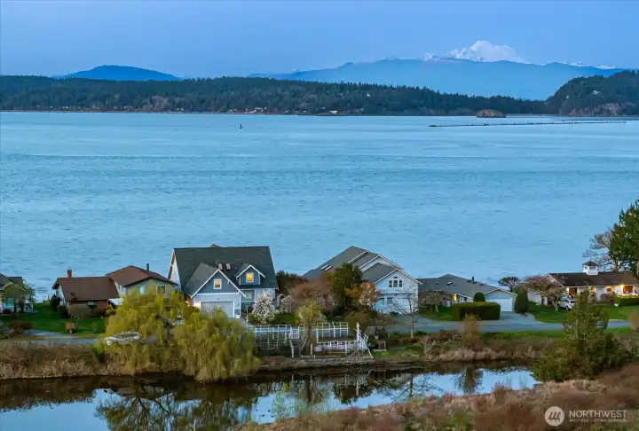 Custom-built waterfront retreat on Dugualla Bay with 60 feet of no-bank beach and unforgettable views of Mount Baker, islands, boats sailing by, and eagles soaring overhead. Built by the owner in 2003, this nearly 3,000-square-foot home offers 2 bedrooms plus 2 additional rooms, with spacious living areas on both the main and upper levels. Walls of waterfront windows, plantation shutters, and a beautifully crafted fireplace with custom bookcases create warmth and character throughout. Main-floor living offers ease and comfort, while upstairs provides generous flex space, including a craft room and a large room above the garage ideal for creating a dream space. Maybe you need a playroom, studio, workout space, office, guest overflow, or storage. Outside, the mature cottage garden—featured on the Oak Harbor Garden Tour—evokes the feel of Nantucket in the Northwest with the greenhouse, gurgling fountain, huge magnolia tree, and a bounty of perennial treasures. Across the street, a fenced garden along the estuary includes marionberries, peach and apple trees, and room for abundant vegetable gardening. Not only can you crab and fish right in front of your own home, but oyster farming is popular here, too! From sunrise over the bay to sunset alpenglow on Mount Baker, this is a home that invites you to slow down, stay, and play! Be sure to check out the links for more photos and videos!