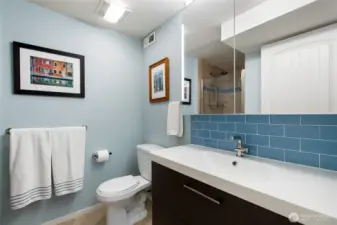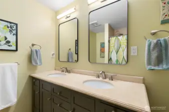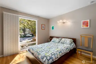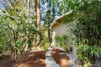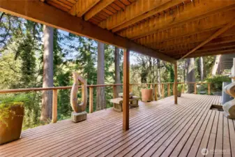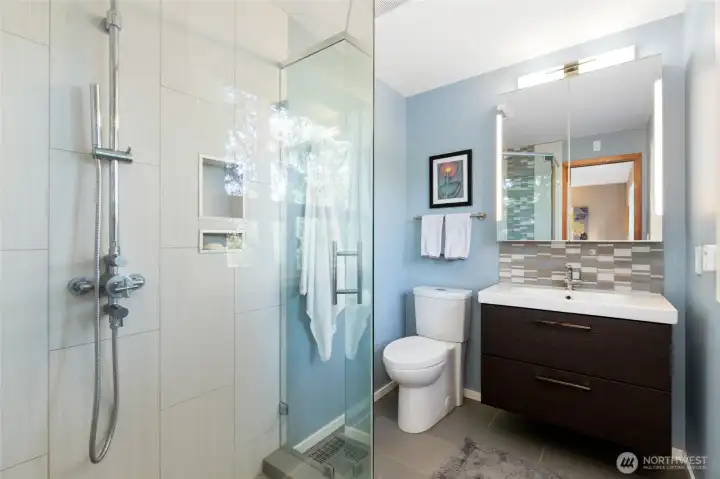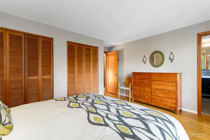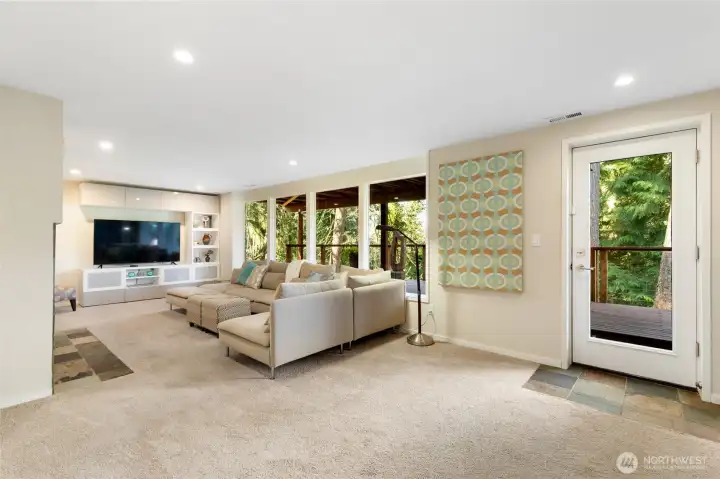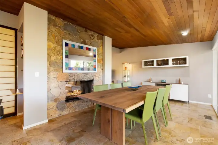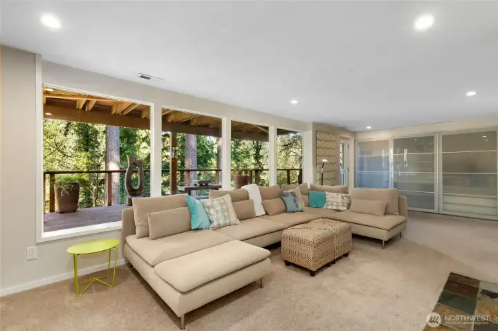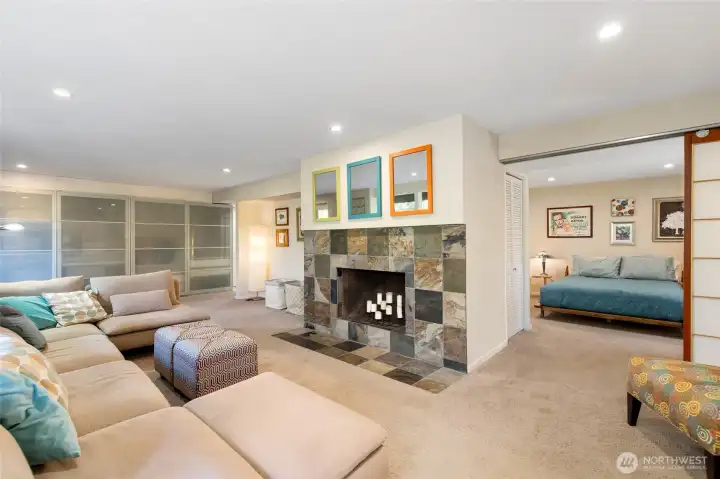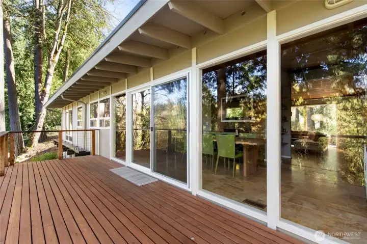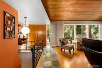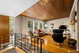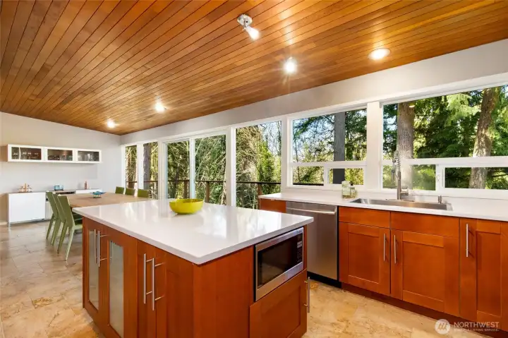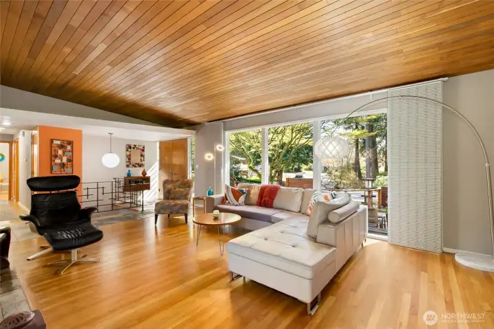 Beautifully updated mid-century modern home backing to a serene greenbelt with stunning territorial views. The main level features an open-concept floor plan with hardwood floors, travertine tile, and a two-sided gas fireplace. The light fixture in the entry is original to the house. The modern kitchen offers quartz countertops and flows seamlessly into the dining area with access to the deck—ideal for indoor-outdoor living. The main-level primary suite includes an en-suite bath for convenient main-floor living. The lower level includes a spacious bonus room with access to a second deck, an additional bedroom, full bath, and laundry area—providing flexible living options. Additional highlights include expansive floor-to-ceiling windows, updated bathrooms, new interior doors, and a garage with epoxy flooring and workbench. Cedar decks with cable railing invite you to relax and enjoy the surrounding natural setting. Conveniently located near parks, trails, and amenities, with easy access to major commuting routes and highly rated Lake Washington schools.