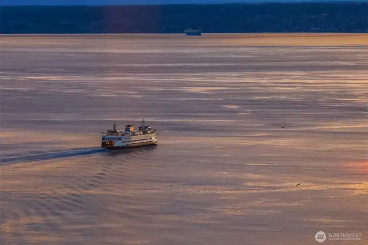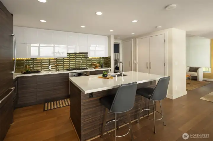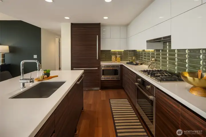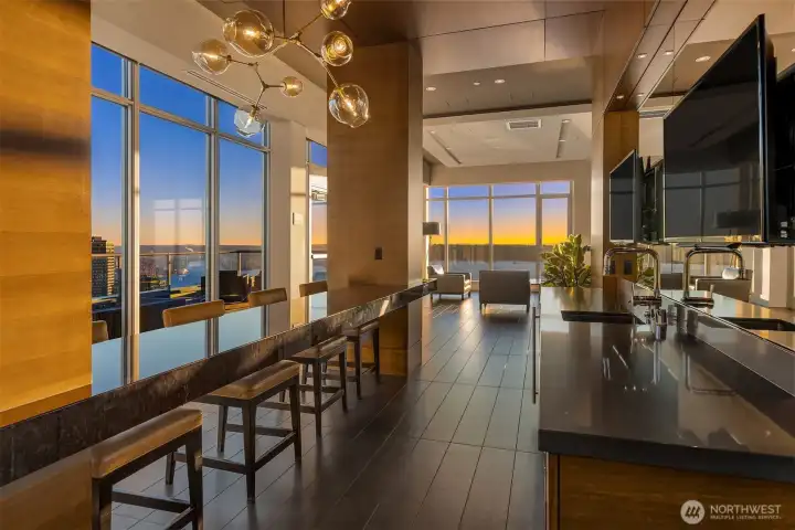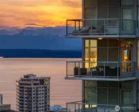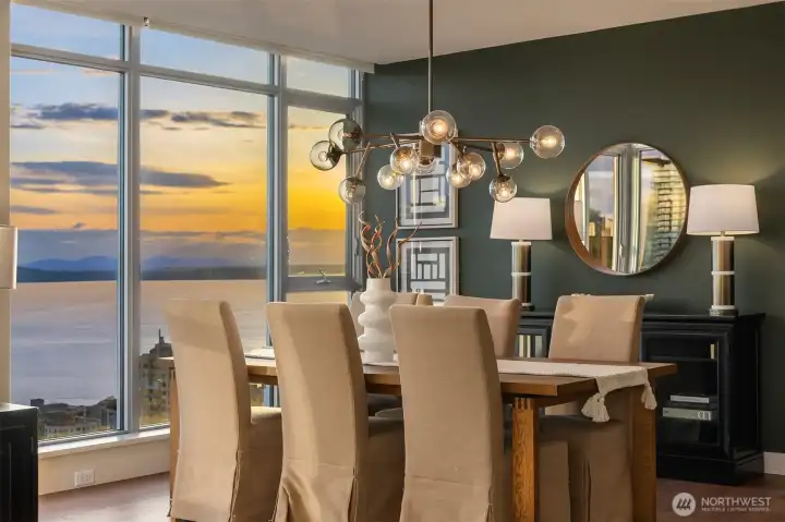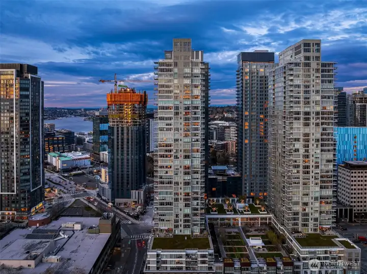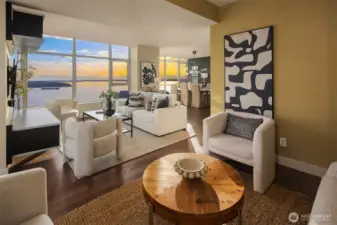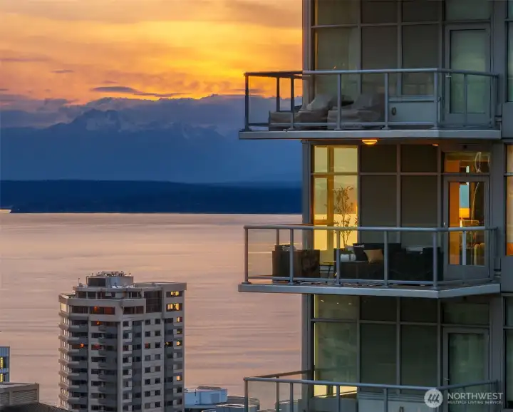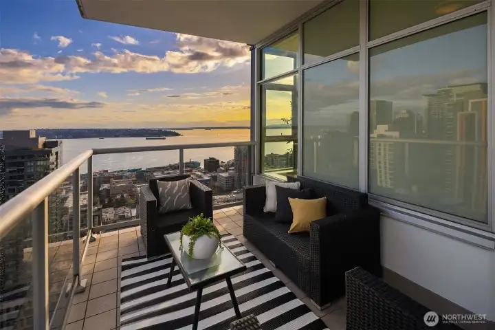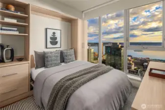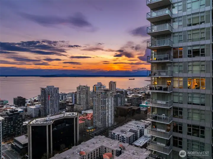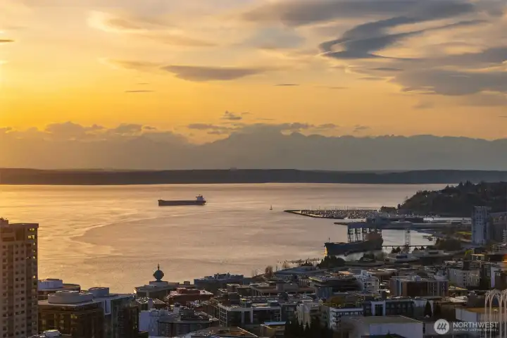 As one of the most sought-after floorplans in the building, this rare 34th floor SW corner 2BD+Den is perched above the city with panoramic views of Elliott Bay, the Olympic Mountains, and the skyline. Walls of glass capture ever-changing skies and weather systems rolling in from the west, bringing movement and depth to the view in every season. Expansive yet comfortable interiors open to a large, covered balcony that extends the living space for year-round use. The kitchen anchors the space with sleek European cabinetry, quartz countertops, chic subway-tiled backsplash, and a premium appliance suite including a Bosch gas cooktop, a Thermador paneled refrigerator, and a cabinet-front dishwasher. The adjoining living/dining spaces create an effortless setting for both entertaining and everyday living, while the den offers flexibility for a home office, guest room, or additional lounge area. The generously sized BDs are thoughtfully separated for privacy, offering custom closets, with a convenient Murphy bed/desk built-in in the guest rm. The spa-inspired stone/marble bathrooms are lovely, but the view of the sunsets from the guest shower, priceless. Designer light fixtures, media center, decorative wall coverings, motorized shades, A/C, and more. Insignia delivers a resort lifestyle with 24-hour concierge service, two-story fitness center w/pool, a screening room, 7th-floor park, 41st-floor rooftop lounges, dog run, and much more! 2 premium parking spaces / 1 storage included.