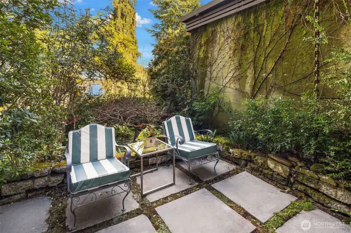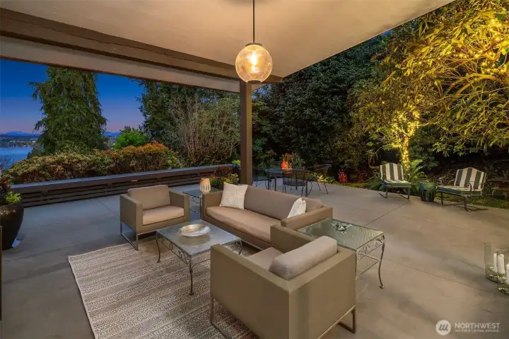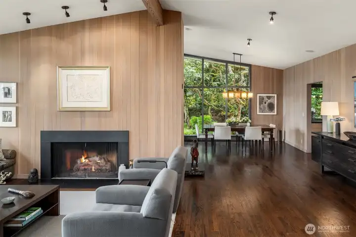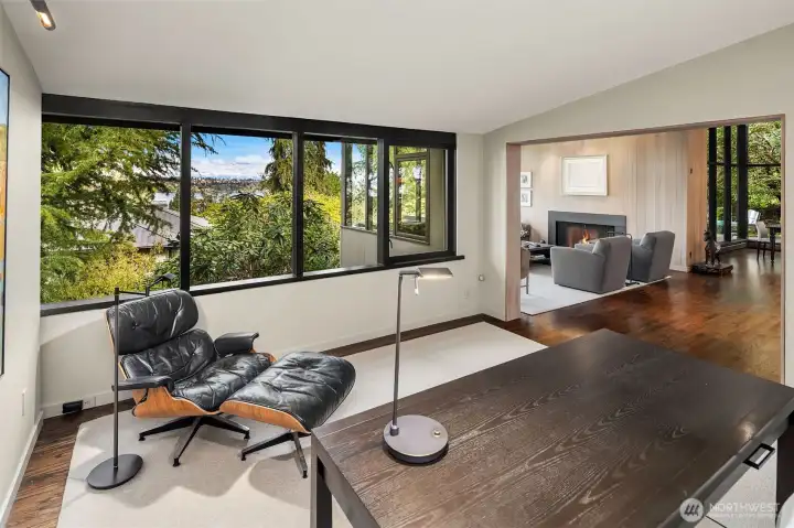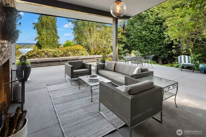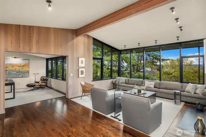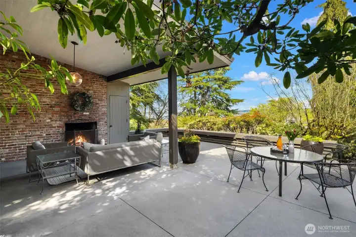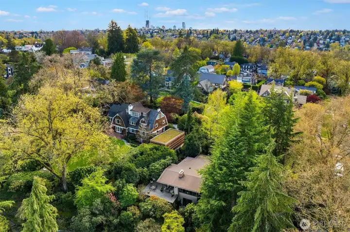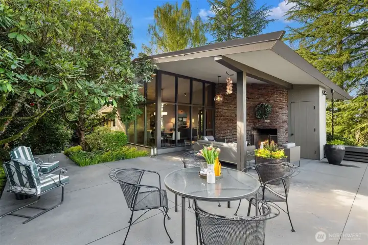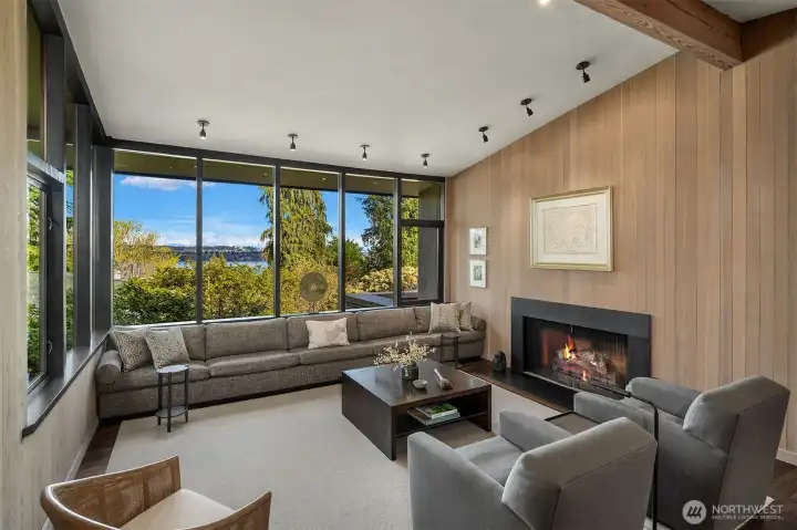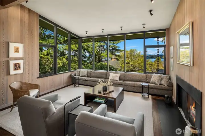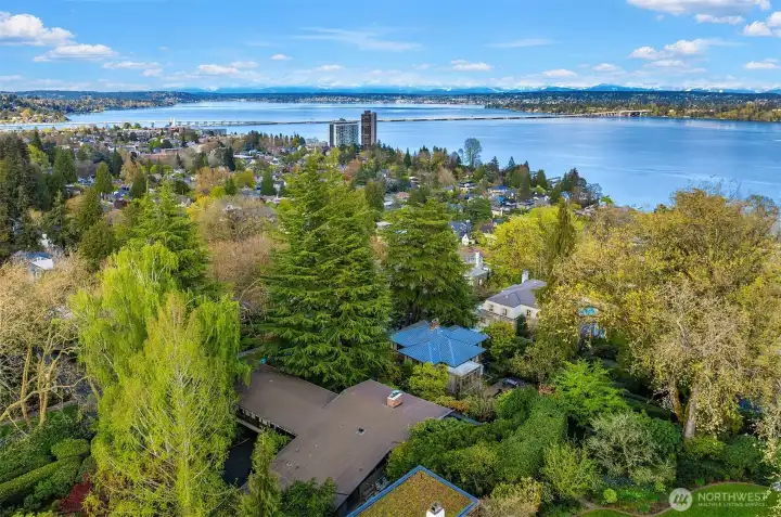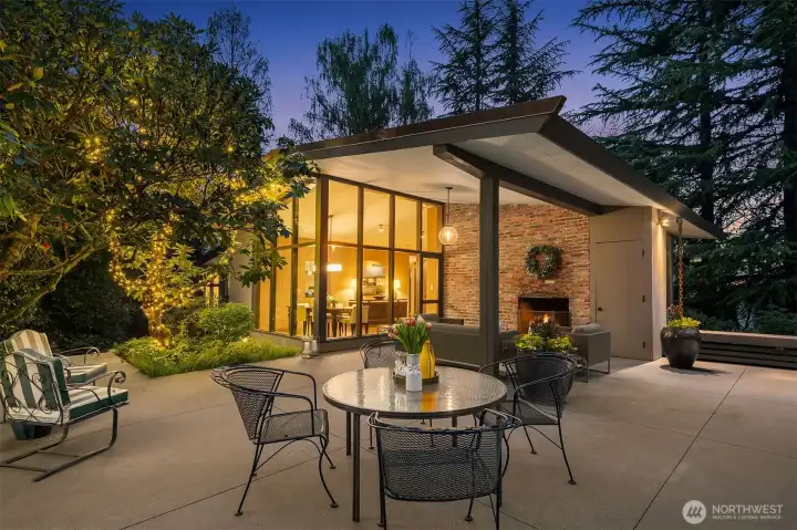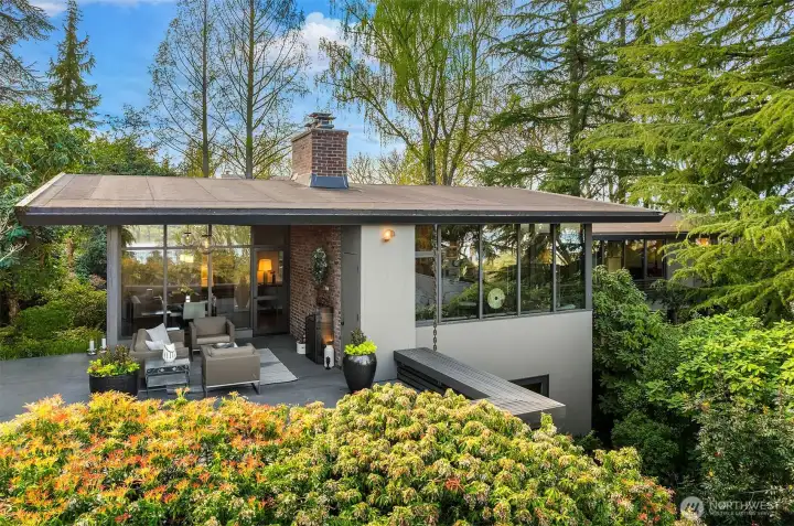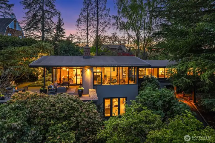 Thoughtfully sited high off a coveted street in Washington Park, this exceptional mid-century modern residence—originally designed by renowned Northwest architect Roland Terry and thoughtfully refined by Steve Hoedemaker—offers a rare blend of architectural pedigree and modern comfort. Enveloped by lush, curated gardens of magnolias, camellias, rhododendrons, and other ornamentals on a 14,400 SF lot, the home captures filtered views of Lake Washington, Bellevue, and the Cascades. Walls of glass frame outlooks from every room, creating a seamless connection to nature anchored by the fireplace – one in living room and one for the outdoor space. The expansive living and dining areas flow to the inviting outdoor patio perfect for hosting memorable gatherings. The spacious kitchen with limestone counters and updated appliances will serve your daily and special event needs complimented by an adjoining relaxed media room and guest bath. A serene and luxurious primary suite with dressing room and spa-like bathroom provides comfort and retreat. The second main floor bedroom, library/office with built-ins and lake views, and flexible guest and lower-level spaces provide versatility. Extensive 2011 updates by Schuchart/Dow ensure turnkey living in this legacy property with refined design and privacy in one of Seattle’s most sought-after neighborhoods. The winding driveway lands you at the two-car carport with EV charger as you step out to your serene and private sanctuary.
