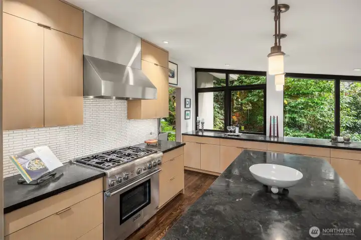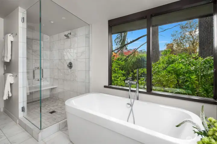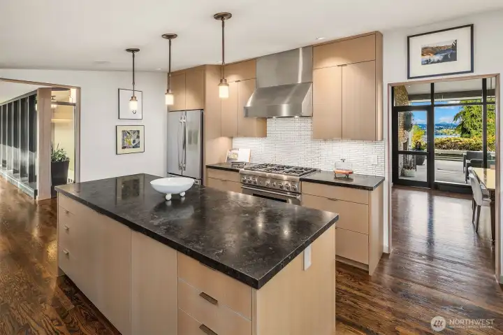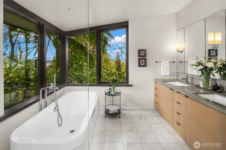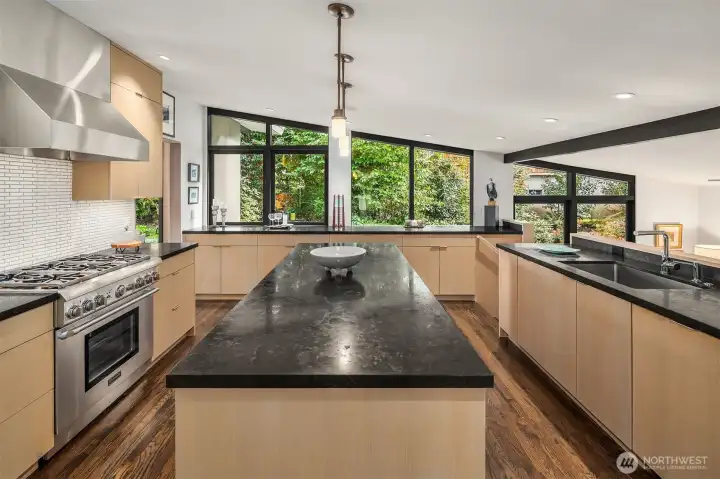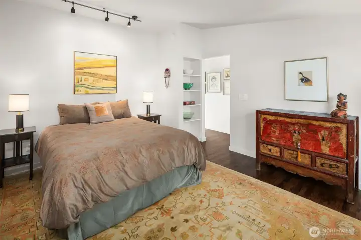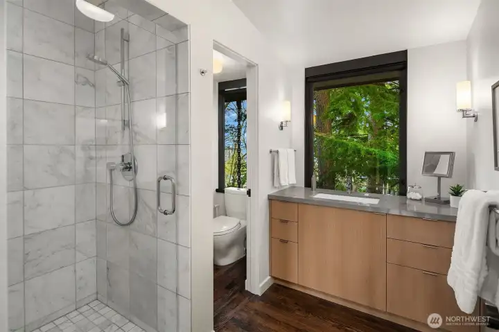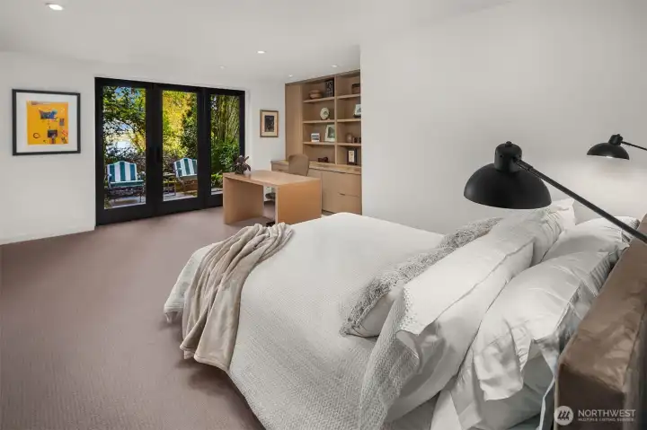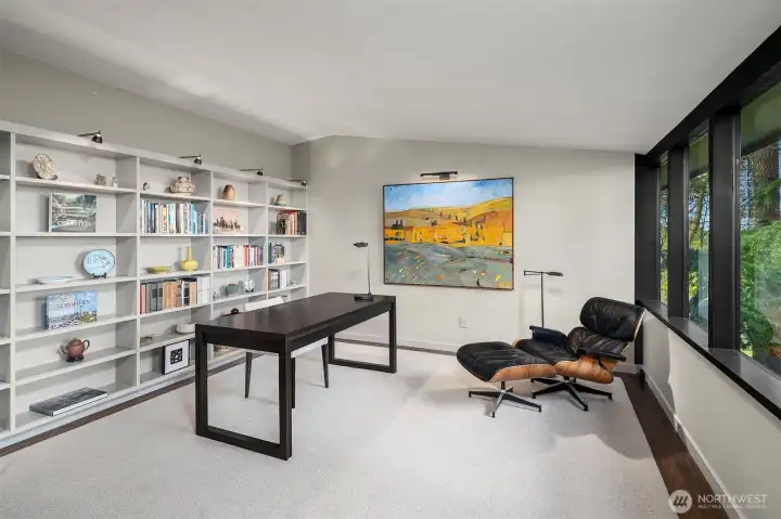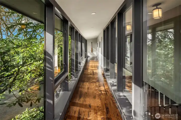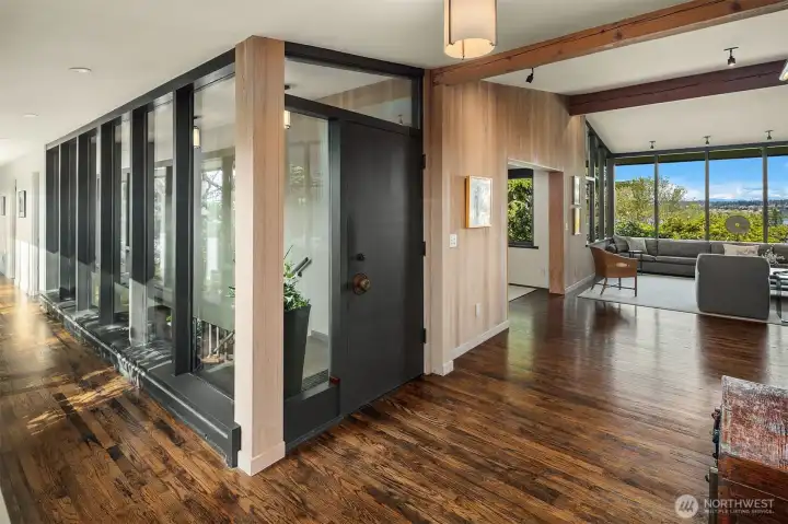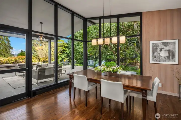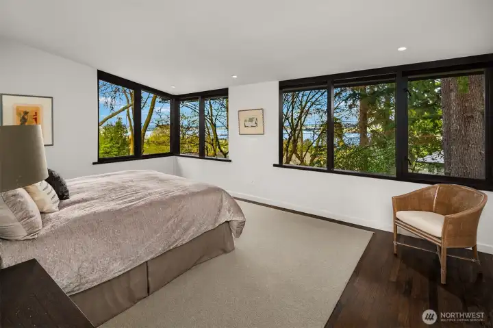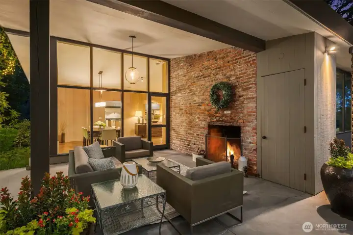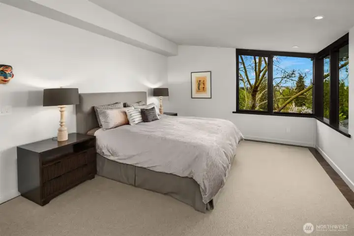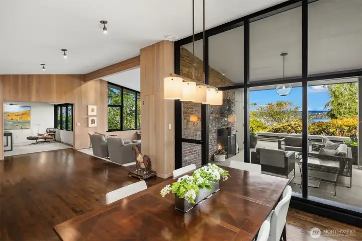 Thoughtfully sited high off a coveted street in Washington Park, this exceptional mid-century modern residence—originally designed by renowned Northwest architect Roland Terry and thoughtfully refined by Steve Hoedemaker—offers a rare blend of architectural pedigree and modern comfort. Enveloped by lush, curated gardens of magnolias, camellias, rhododendrons, and other ornamentals on a 14,400 SF lot, the home captures filtered views of Lake Washington, Bellevue, and the Cascades. Walls of glass frame outlooks from every room, creating a seamless connection to nature anchored by the fireplace – one in living room and one for the outdoor space. The expansive living and dining areas flow to the inviting outdoor patio perfect for hosting memorable gatherings. The spacious kitchen with limestone counters and updated appliances will serve your daily and special event needs complimented by an adjoining relaxed media room and guest bath. A serene and luxurious primary suite with dressing room and spa-like bathroom provides comfort and retreat. The second main floor bedroom, library/office with built-ins and lake views, and flexible guest and lower-level spaces provide versatility. Extensive 2011 updates by Schuchart/Dow ensure turnkey living in this legacy property with refined design and privacy in one of Seattle’s most sought-after neighborhoods. The winding driveway lands you at the two-car carport with EV charger as you step out to your serene and private sanctuary.