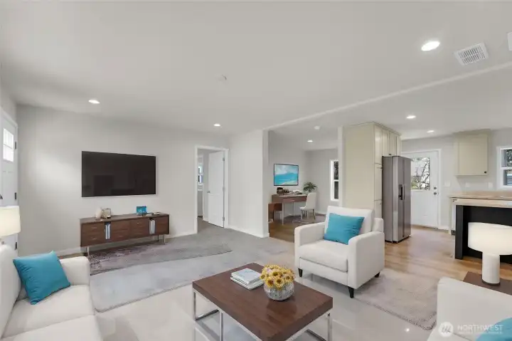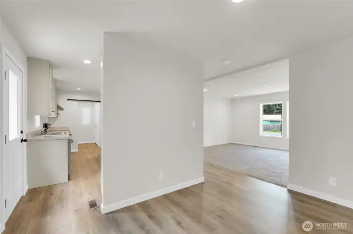 Enjoy this brand-new home on flat, usable lot with plenty of space to enjoy the outdoors. This 3 bedroom,2 bathroom home also includes a versatile flex space perfect for a home office, playroom, or guest room. The open concept layout offers a bright and spacious living area that flows into the kitchen and dining space. Ideal for everyday living and entertaining. The kitchen features a large eating island with plenty of seating and workspace. The private primary suite includes an ensuite bathroom bathroom and ample closet space. With the modern finishes and a functional design, this home offers comfort space, easy living.