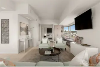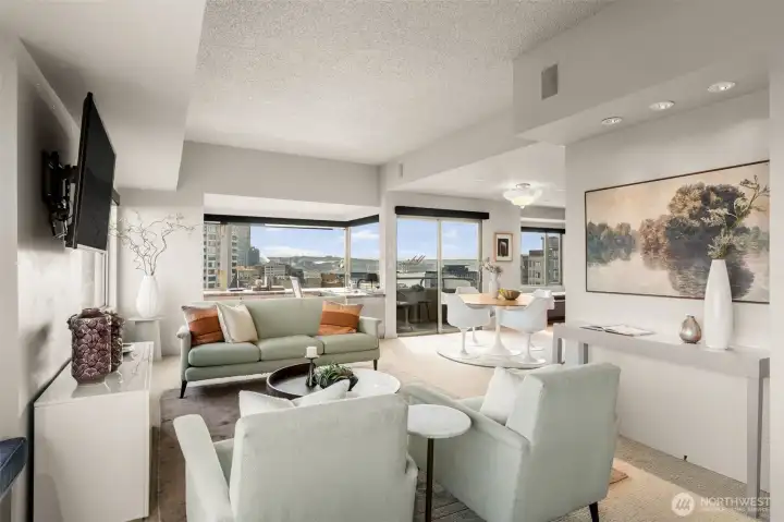 Welcome to Bay Vista and this light filled corner residence showcasing sweeping views from Lake Union and the Space Needle to Mt Rainier and Puget Sound. This 1302 sq ft single level, open concept, 1 Bedroom (could be converted to two bedrooms) 1.75 bath fully remodeled home features a spacious 5 piece primary en-suite with heated flooring, custom built-ins throughout, 30 feet of granite countertop, high end appliances, and so much more. Residents enjoy 24/7 concierge service, a dedicated parking space, and a private storage unite all within a close-knit community, supported by a strong HOA. A standout amenity is the spectacular 6th-floor plaza, featuring a walking path, pickleball court, community garden with raised beds, an outdoor BBQ kitchen with skyline views - the perfect place to enjoy New Year’s Eve Fireworks! This is the one you have been waiting for!