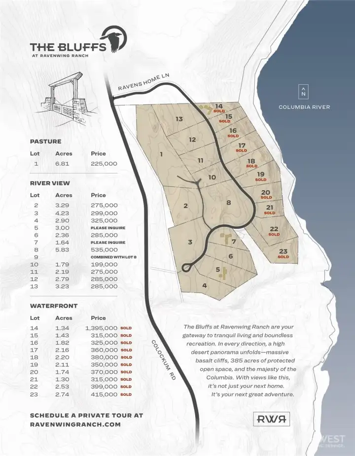 Where Every Sunset Feels Like Coming Home. Set within a private gated community, this exceptional 5.8-acre homesite captures sweeping views of the Columbia River and offers a rare sense of space and serenity. Thoughtfully positioned to embrace both light and landscape, the property presents an ideal canvas for a custom residence designed around effortless, elevated living. Private trails and a community beach create a lifestyle rooted in nature, meaningful experiences, and time spent together. Here, days unfold with intention. Morning walks overlooking the river, afternoons spent outdoors, and evenings defined by quiet beauty and connection. With few parcels of this caliber remaining, this is a limited opportunity to create a legacy retreat defined by privacy, natural beauty, and timeless appeal. Water, electricity, fiber optics in street. Perc test completed. Create your custom retreat with your chosen builder/architect or partner with ours. Conveniently close to the region’s dining, wineries, golf, and outdoor recreation, with easy access to Mission Ridge and Pangborn Airport.