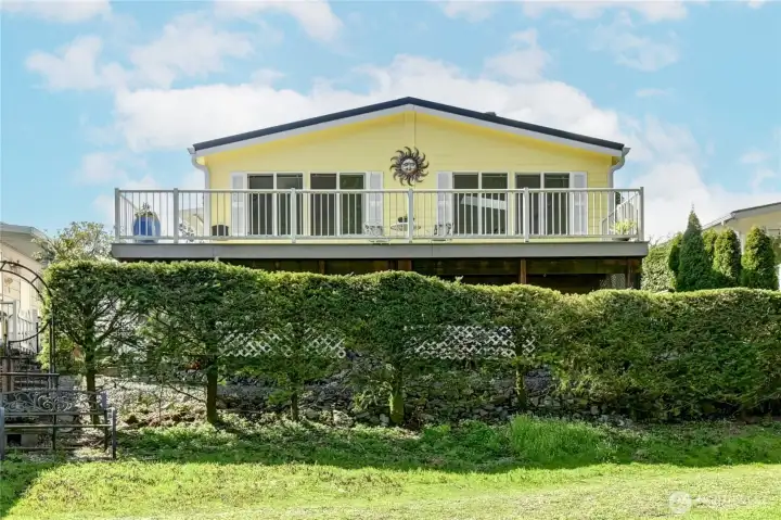VIEWS! Enjoy scenic & abundant wildlife from your living room & sprawling composite deck. Private gated access to the lake trail. This happy home welcomes you with an open entry featuring tile flooring, flowing into a bright living room & dining area. The kitchen is well-appointed with a skylight, abundant storage including a pantry, pull-out shelving. Expansive breakfast bar, upgraded tile countertops & marble backsplash. Vaulted ceilings & ceiling fans featured throughout the home, adding to an open feel. The primary bathroom includes a skylight, dual sinks, an extra large, upgraded tile & marble shower, tile countertops, vinyl plank flooring. The guest bathroom offers a solar tube, granite countertop, and tile flooring. Exterior features durable metal roof that extends over walkway entries and a double carport, complete with a ramp leading to the main entrance. Also includes an 8' x 12' insulated shed with electricity and a smaller utility shed. Monthly rent covers water, sewer, cable, and garbage services. Internet is also available.