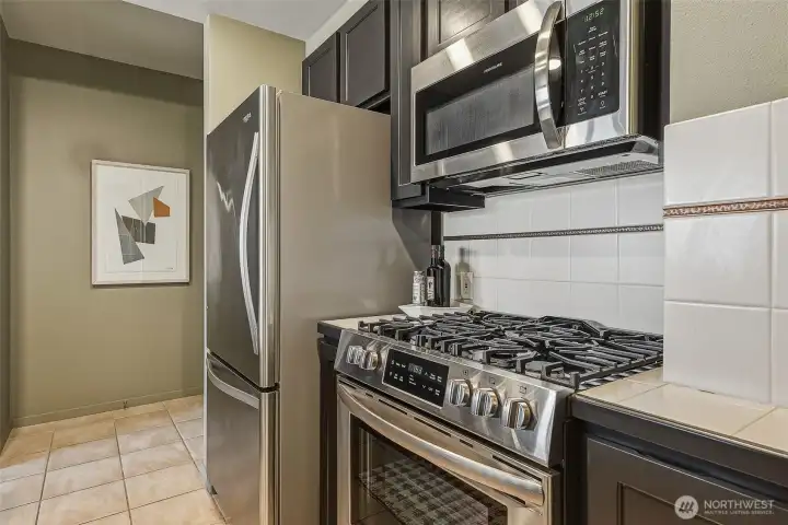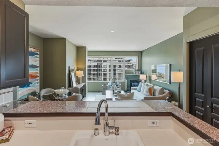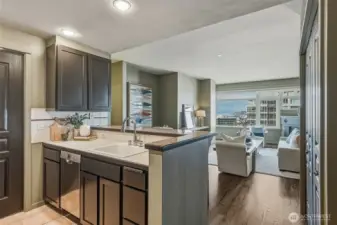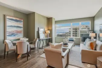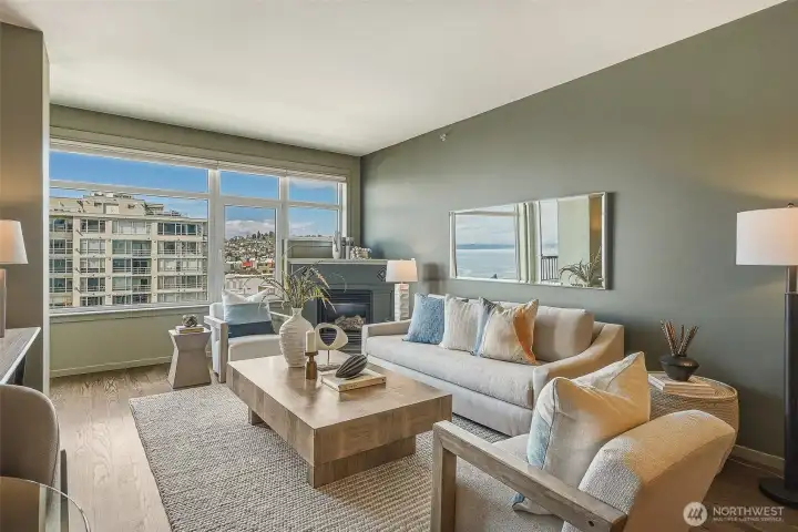 Experience stylish city living in this chic, thoroughly updated home at the fabulous, amenity-rich Ellington. This light-filled unit features refinished hardwood floors, new carpet, designer paint colors, newer stainless kitchen appliances and a brand new in-unit laundry. Enjoy fantastic closet and storage space (walk in closet in bedroom, full wall pantry/household goods/coat closet off kitchen and abundant cabinetry in the full bath) and a cozy gas fireplace—plus unforgettable Sound, Mountain and City views overlooking the Space Needle and Sculpture Park. The Ellington is a beautifully maintained, full service community with 24-hour concierge service, two guest suites available for nightly rental, a well equipped fitness center, inviting indoor and outdoor gathering spaces, conference/meeting room and reservable party space. The HOA is strong and well-managed with no special assessments, and the building is pet-friendly with no rental cap. Assigned parking and storage are included. Turn-key and unbeatable location—close to transit and just steps to everything Belltown, Uptown and Pike Place have to offer. Easy, elegant and fun living awaits!