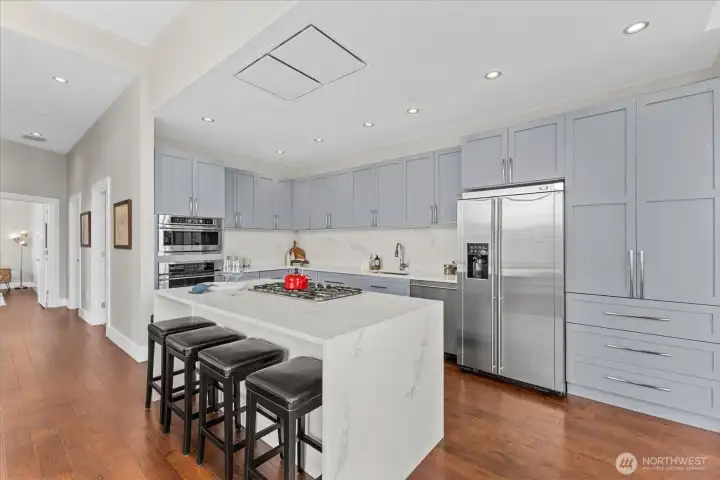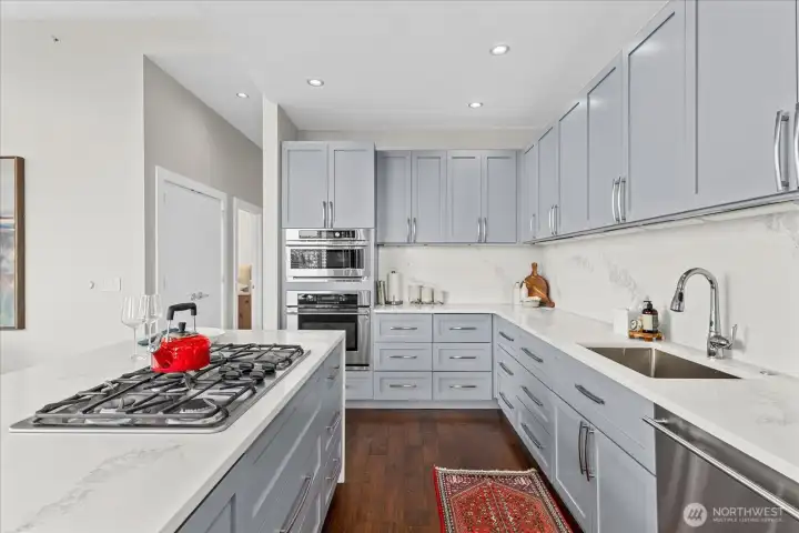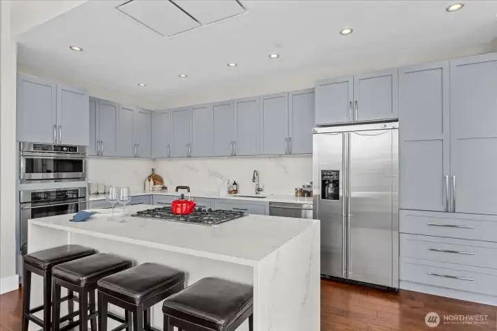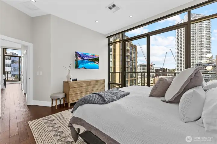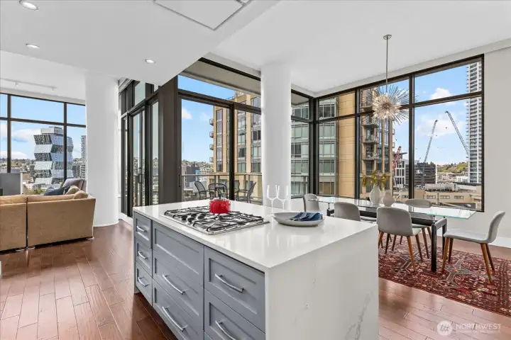 Penthouse living in the heart of South Lake Union—where light, views, and scale converge. Perched atop the sought-after Azur tower at 2200 Westlake, this expansive 2BD/2BA residence offers nearly 1,650 square feet of refined living with soaring ceilings, walls of glass, and sweeping city, lake, and territorial views. An open-concept great room anchors the home, seamlessly connecting living, dining, and an updated chef’s kitchen—perfect for both everyday living and entertaining. Generous kitchen island flows to full-sized dining area all surrounded by views. Motorized Hunter Douglas blinds and Control4 home tech upgrades are the pinnacle of luxury and convenience. The primary suite is a true retreat with a spa-like bath, soaking tub, and walk-in closet, while the second bedroom provides flexibility for guests or a home office. Enjoy indoor-outdoor living with a 2 private terraces capturing the energy of the city below. Residents of 2200 Westlake enjoy a full suite of amenities including concierge service, fitness center, sauna, rooftop terrace, resident lounge, private theater, and secure parking. This home offers two parking spaces with electric charging capability. Located above Whole Foods and steps to Amazon, Lake Union, dining, and nightlife, this is urban living at its most effortless. A rare opportunity to own a true penthouse in one of Seattle’s most connected neighborhoods.