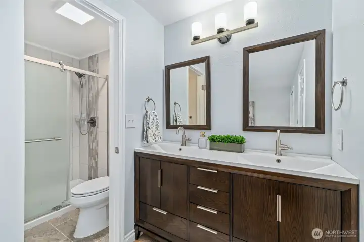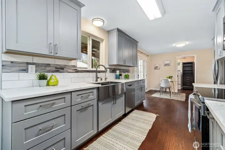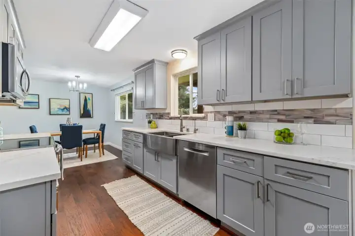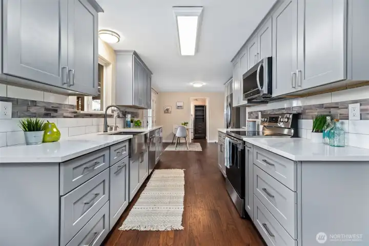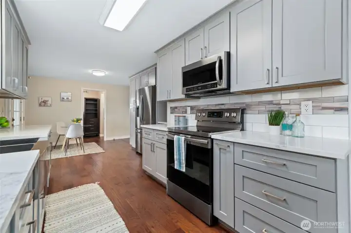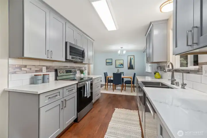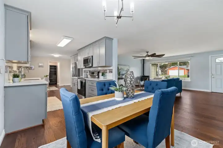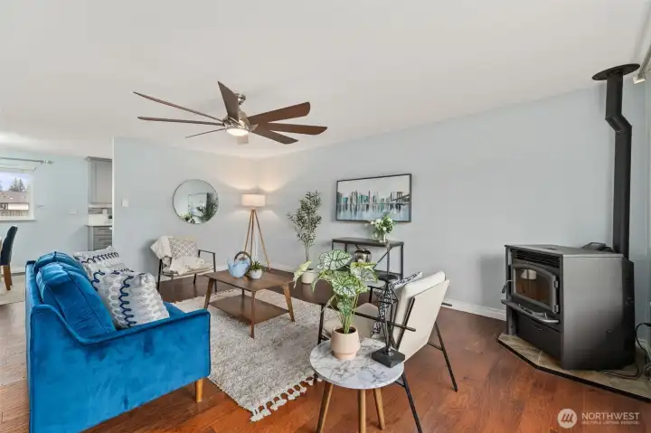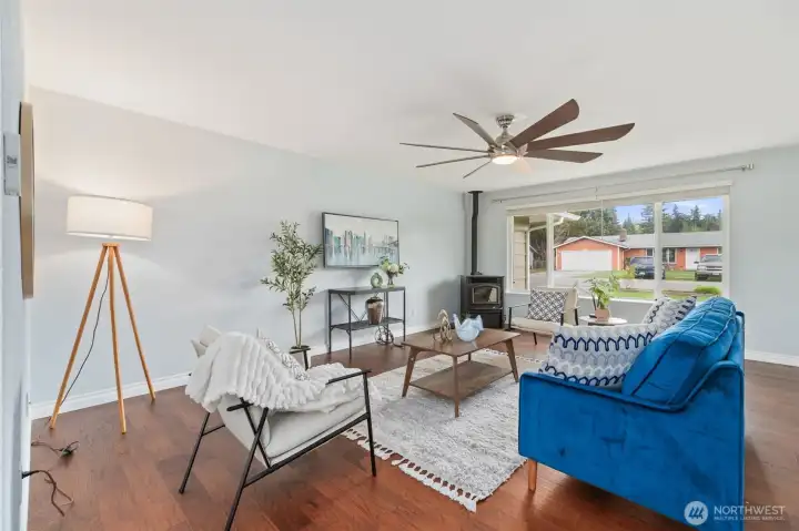 Updated and turnkey single story living with attached 2-car garage plus additional detached 720sf heated SHOP & RV/boat parking on large level lot! Great room style family room with freestanding pellet stove. High end remodeled kitchen with slab quartz counters, stainless steel appliances, under cabinet lighting & ample storage. Primary suite with updated bath including newer dual sink vanity and tile shower surround. Hall bath with newer tile floors, vanity and tile tub surround. Full size laundry room + guest 1/2 bathroom. Fresh white painted millwork and doors throughout. Newer electric heaters and thermostats. Updated fixtures throughout. New exterior paint. Newer roof, gutters, windows, 200amp breaker panel, fence w/concrete curbing. High end new covered composite decking and patio. Shop w/built-in air compressor, 2 propane tanks, 220 outlets & metal roof. Additional 12x16 garden shed. Fully fenced yard with sunny southern exposure. A rare find in convenient location.
