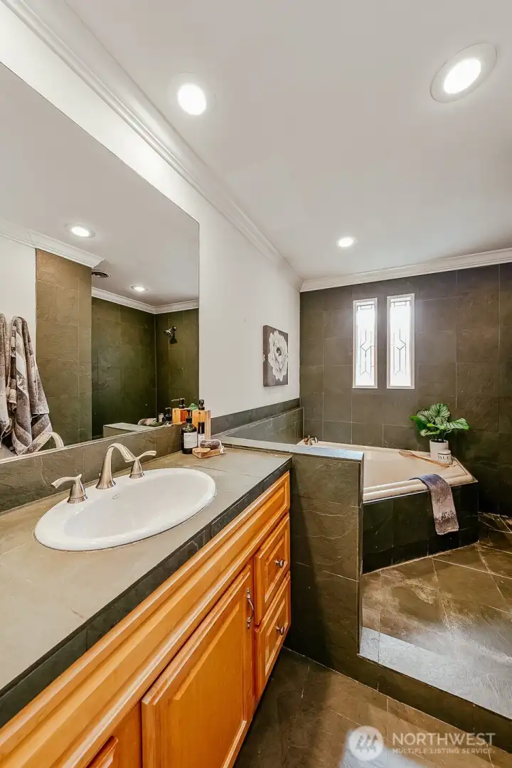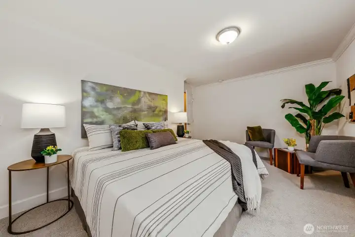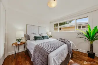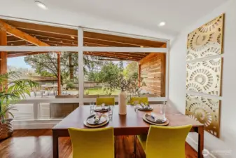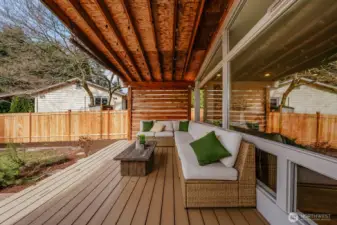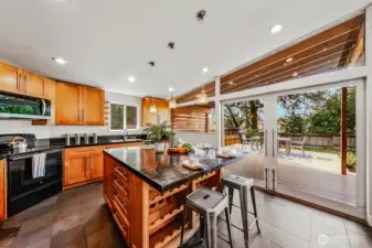 Welcome to this quintessential Ridgecrest midcentury modern, where soaring ceilings and a wall of glass create a light-filled living space anchored by a central fireplace. Double sliding doors open wide to a massive covered deck—perfect for year-round entertaining—flowing effortlessly into the expansive, fenced backyard. The kitchen is made for hosting, with plenty of storage, concrete countertops and a huge island where everyone naturally gathers. Hardwood and stone floors add warmth and texture, while the decadent bath invites you to unwind with a walk-in two-headed shower, tub-for-two and separate water closet. The primary bedroom offers two closets plus extra space for a home office, workout area, or quiet retreat. Great off-street parking plus a generous one-car garage/workshop. You’re just across from Hamlin Park, with The Ridgecrest Public House and everything in North City and at 145th an easy stroll away, not to mention easy access to light rail.
