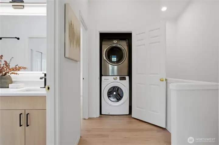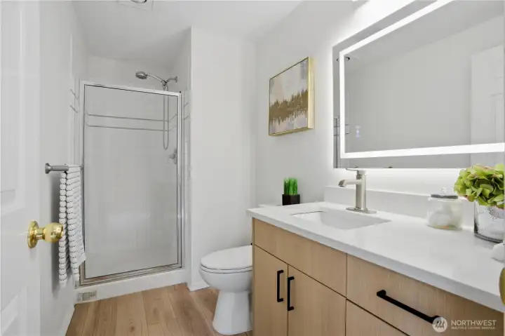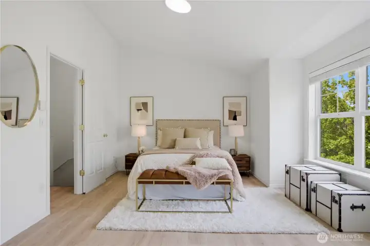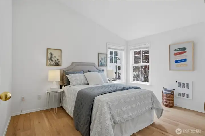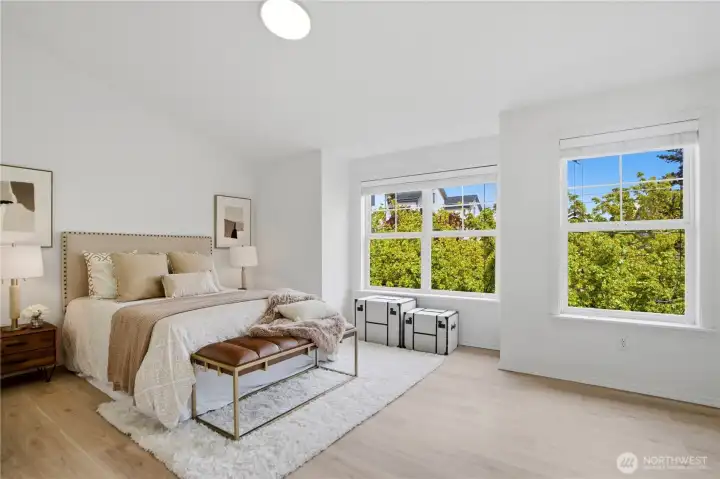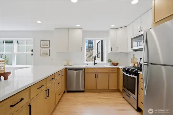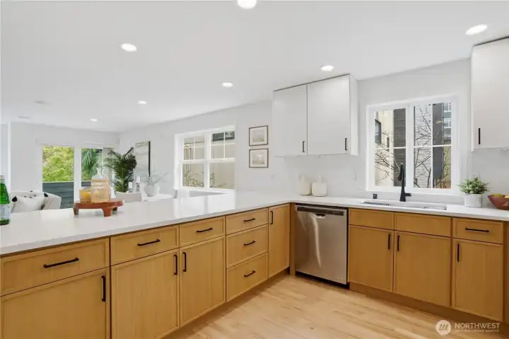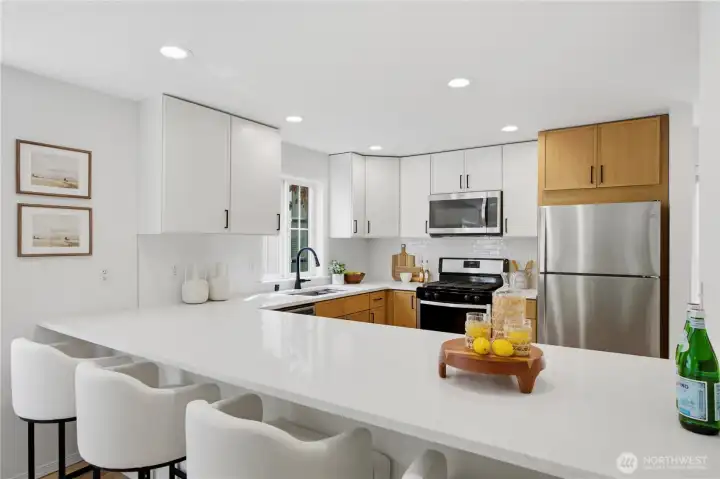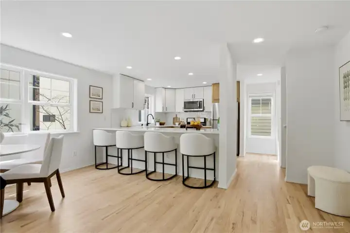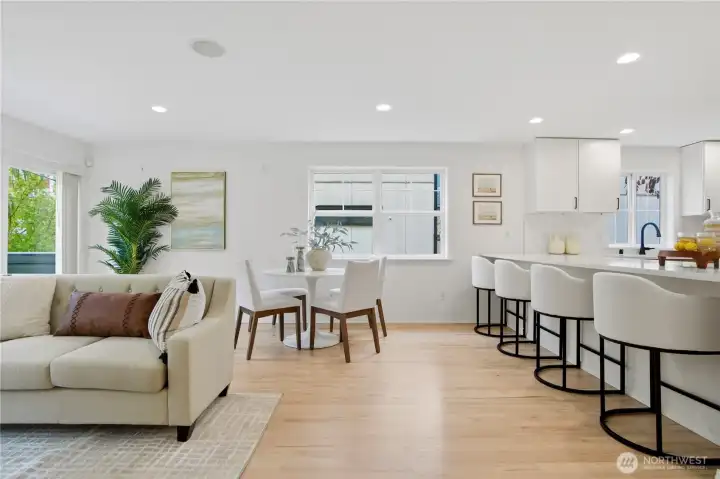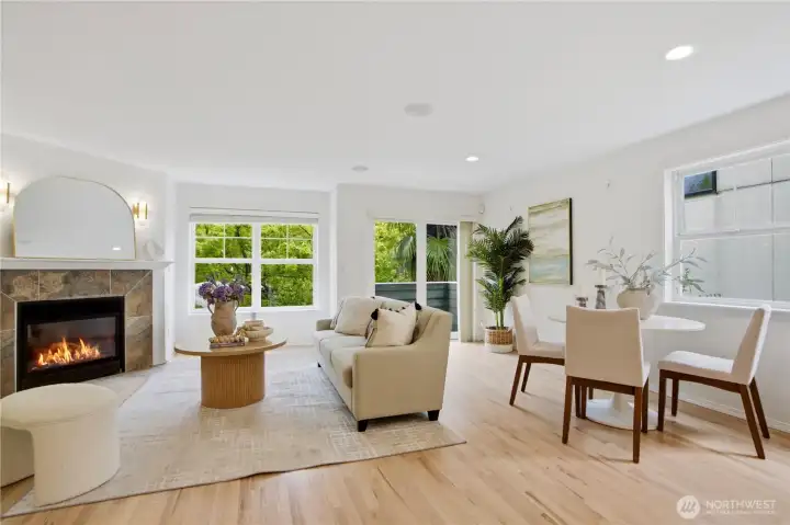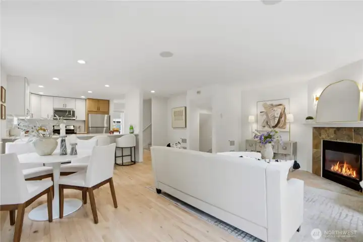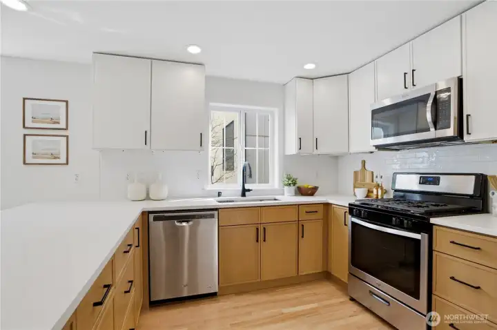 Better than new, this extensively updated Ballard townhome combines modern updates with the comfort of a true home. The light-filled main level features a seamless flow between the living and dining areas, anchored by a remodeled kitchen with two-tone cabinetry, premium stone countertops, and Kohler fixtures. Upstairs, the spacious primary suite offers a quiet retreat with vaulted ceilings and an ensuite bath, alongside a second bedroom with a walk-in closet and convenient in-unit laundry. The entry level provides a versatile third bedroom with a private bath—ideal for a home office or guest space—with direct access to the refreshed, low-maintenance fenced yard. Recent updates include a newer roof (2024), refinished hardwood floors, and fresh interior paint (2026), offering a truly move-in-ready experience, plus an attached garage with EV charger. Tucked in the heart of Ballard, just minutes to parks, cafes, and neighborhood amenities. Don't miss this one!