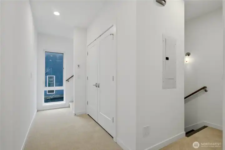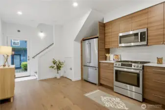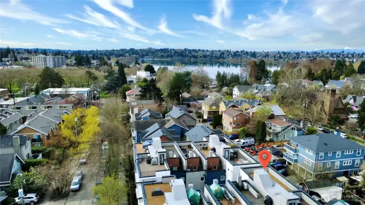Unbeatable Location on a quiet street with steps to Green Lake! This bright modern townhouse has a fabulous view of the lake and mountains on an expansive rooftop deck. Fresh paint, Brand-new carpet. 2 beds, 1.75 baths. Boasting high-end finishes, dark hardwoods and floor-to-ceiling windows. Open-concept kitchen with SS appliances. Tankless Gas Water heater. A tranquil patio garden for you to enjoy the morning coffee. A designated parking space off the alley. One or two blocks away from PCC, Pilates Hub, light rail station and so on. Quick access to buses to downtown Seattle. Enjoy the vibrant style with everyday comfort!