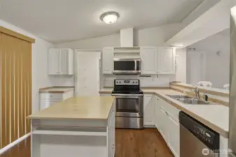 Well-maintained 2001 double-wide manufactured home located on a landscaped lot in a cul-de-sac setting. This 3-bedroom, 2-bath home offers a functional floor plan with a spacious living room featuring vaulted ceilings and built-in shelving. The kitchen includes a breakfast bar and adjacent dining area, providing practical everyday flow. The primary suite features a private bath with a soaking tub. Recent improvements include updated flooring, interior paint, and millwork. Detached garage/shop provides additional space for storage, hobbies, or workspace needs. Conveniently located with access to local amenities, this home presents a move-in ready opportunity with pride of ownership throughout.