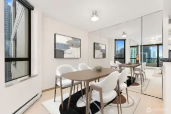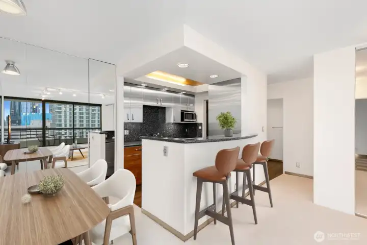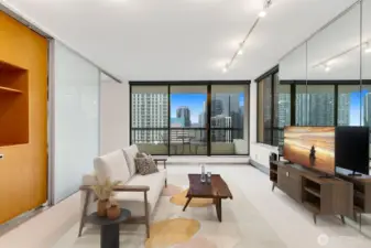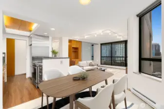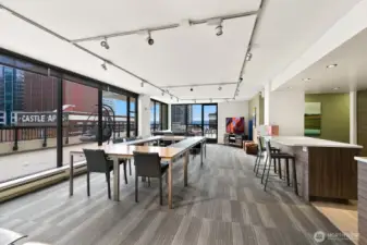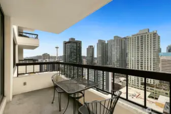 Perched on the 21st floor, this corner residence offers sweeping views of downtown, and the Space Needle. The open-concept living area features floor-to-ceiling windows and a private balcony—perfect for soaking in vibrant city sunsets. Fresh carpeting and sleek stainless details provide a polished, contemporary living experience. Parking and storage included. The building offers a fitness center, pool, hot tub, sauna, club room, expansive community deck with BBQs, and a convenient guest suite. No rental cap. 99 Walk Score. HOA dues cover water, sewer, garbage, and high-speed fiber internet.